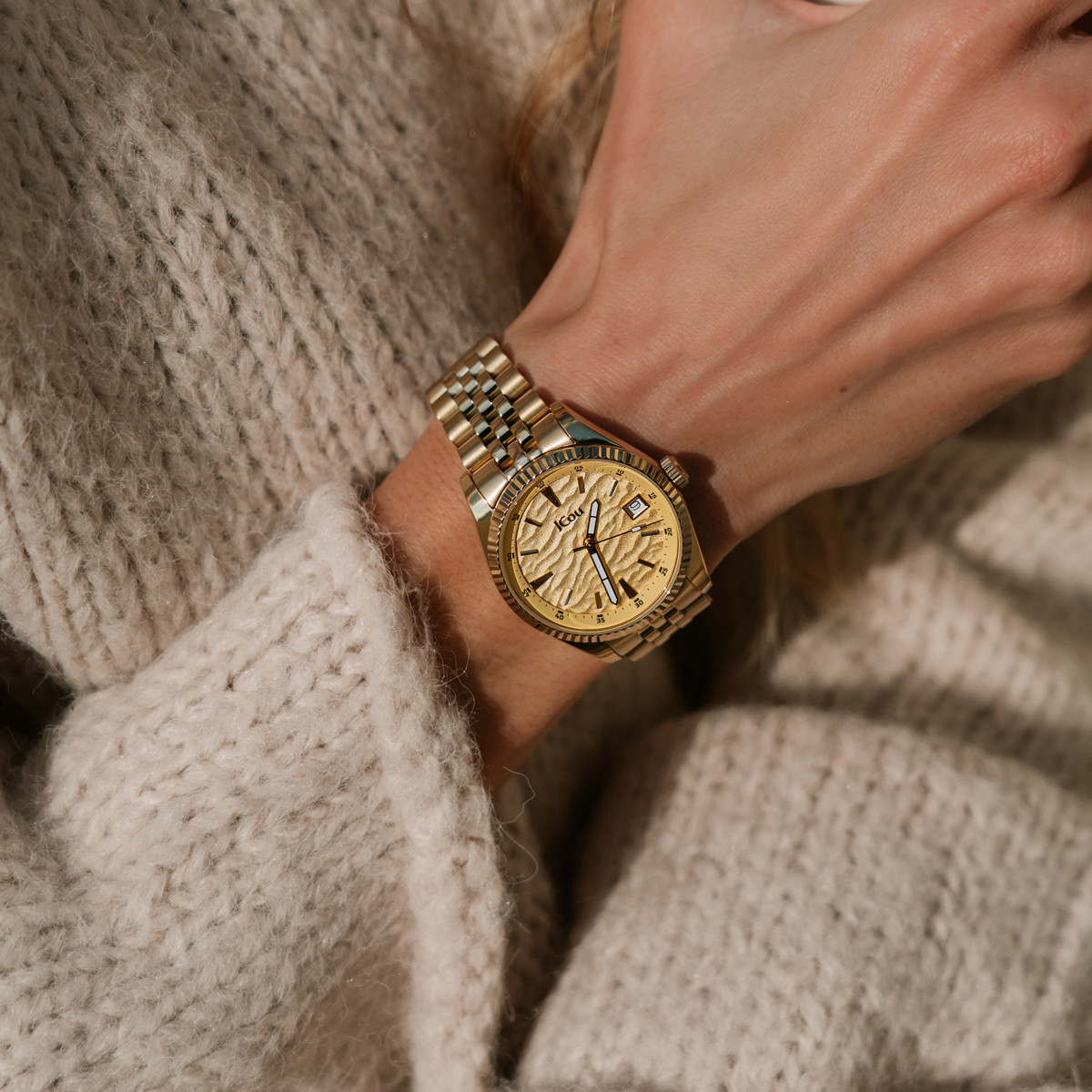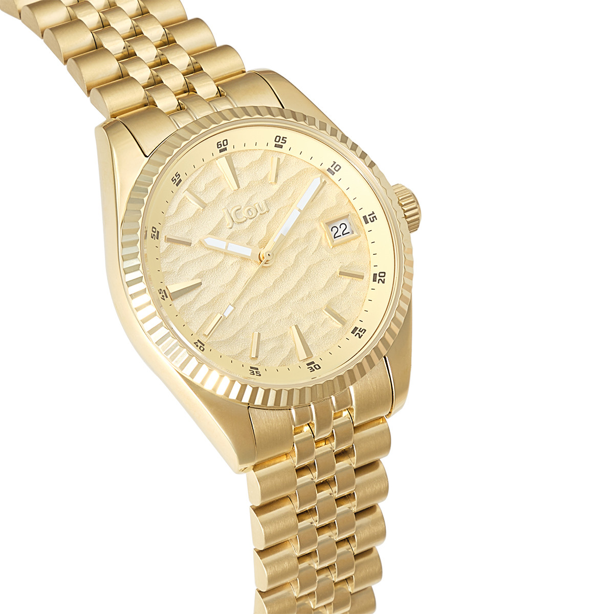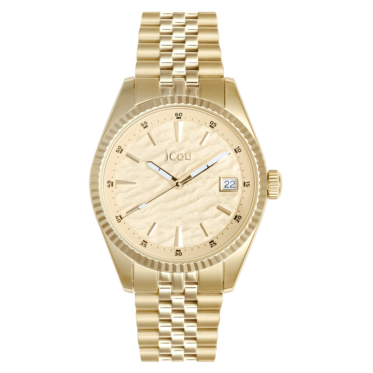 Γυναικείο ρολόι JCOU διαμέτρου 36mm με μηχανισμό QUARTZ ακριβείας. Έχει καντράν χρυσού χρώματος με επίχρυσους δείκτες – λεπτομέρειες και ένδειξη ημερομηνίας. Η κάσα του είναι από ανοξείδωτο ατσάλι με κρύσταλλο από ορυκτό κρύσταλλο ειδικής σκλήρυνσης. Έχει επίχρυσο μπρασελέ από ανοξείδωτο ατσάλι και κούμπωμα ασφαλείας. Είναι αδιάβροχο (10 ΑΤΜ).