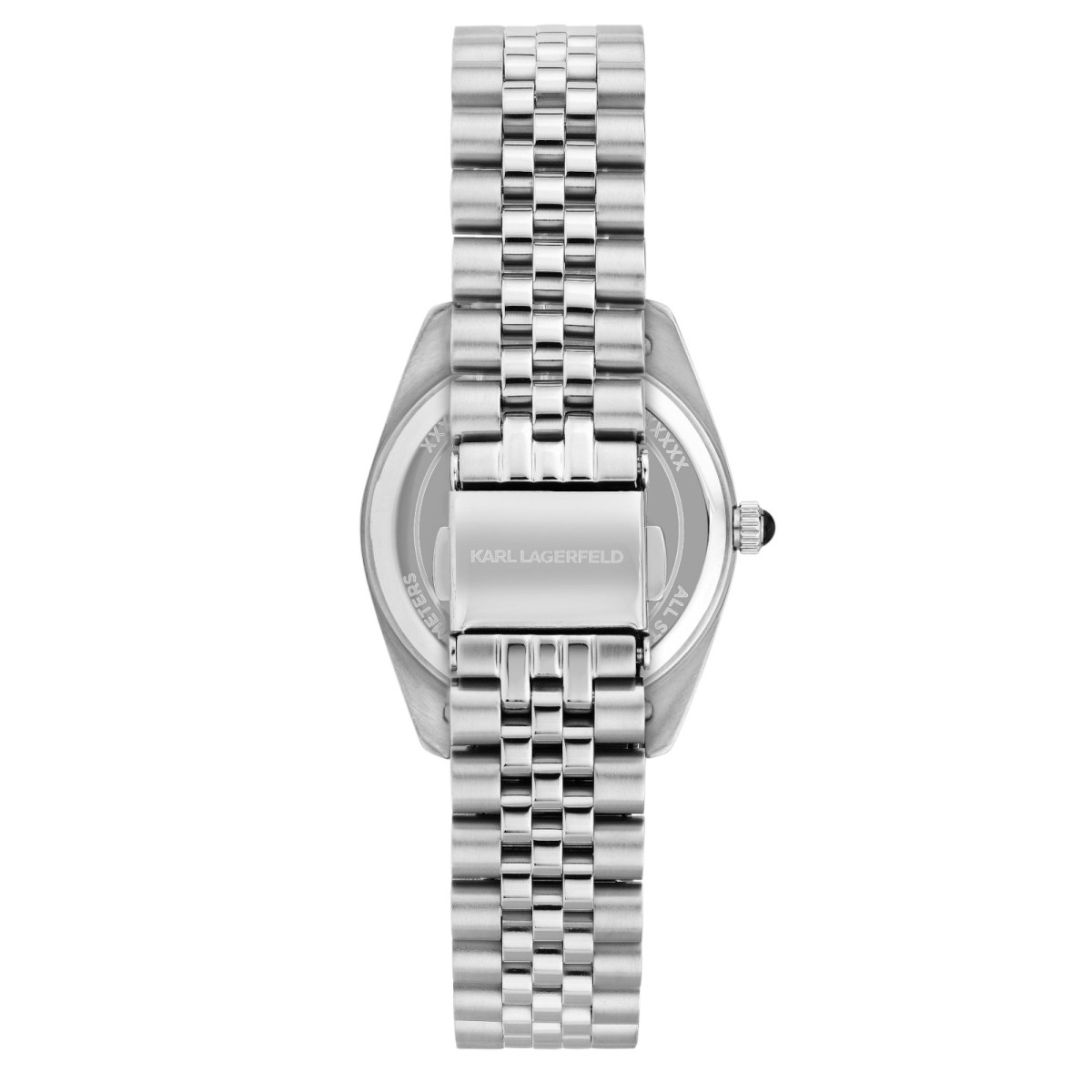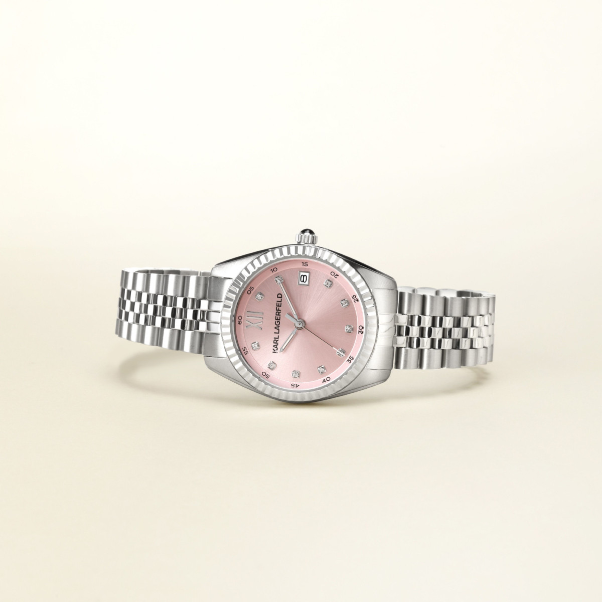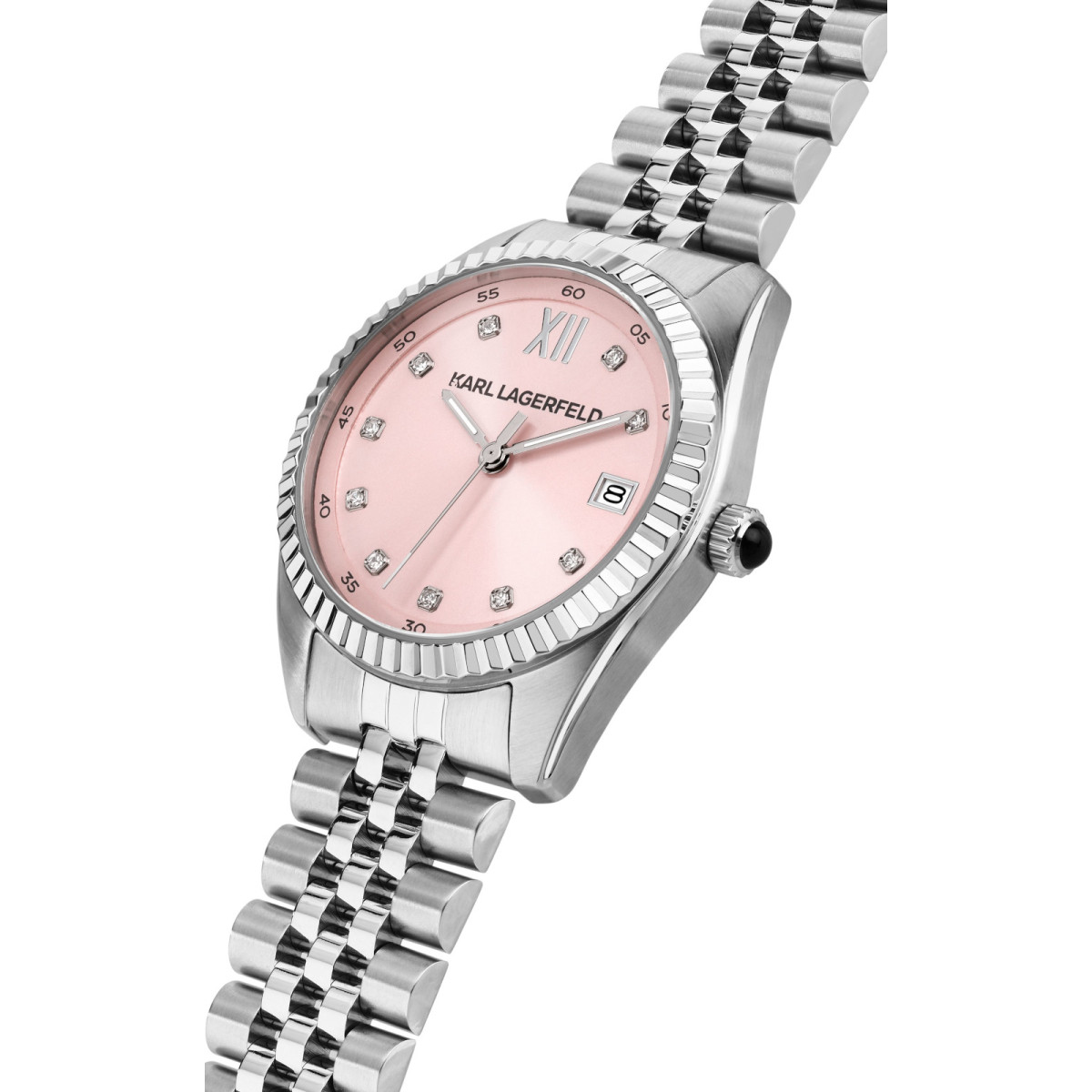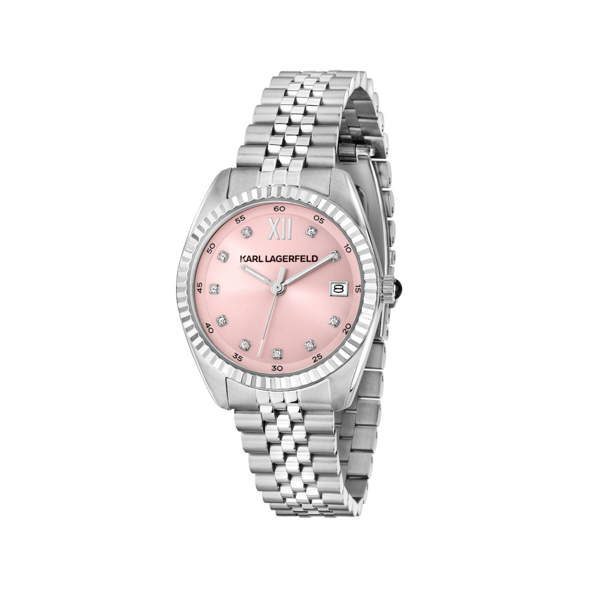 Γυναικείο ρολόι KARL LAGERFELD διαμέτρου 32mm με μηχανισμό Quartz ακριβείας. Έχει ροζ καντράν με ασημί δείκτες και λεπτομέρειες.Είναι διακοσμημένο με πέτρες. Η κάσα του είναι από ανοξείδωτο ατσάλι με κρύσταλλο από ορυκτό κρύσταλλο. Έχει μπρασελέ από ανοξείδωτο ατσάλι και κούμπωμα ασφαλείας.
