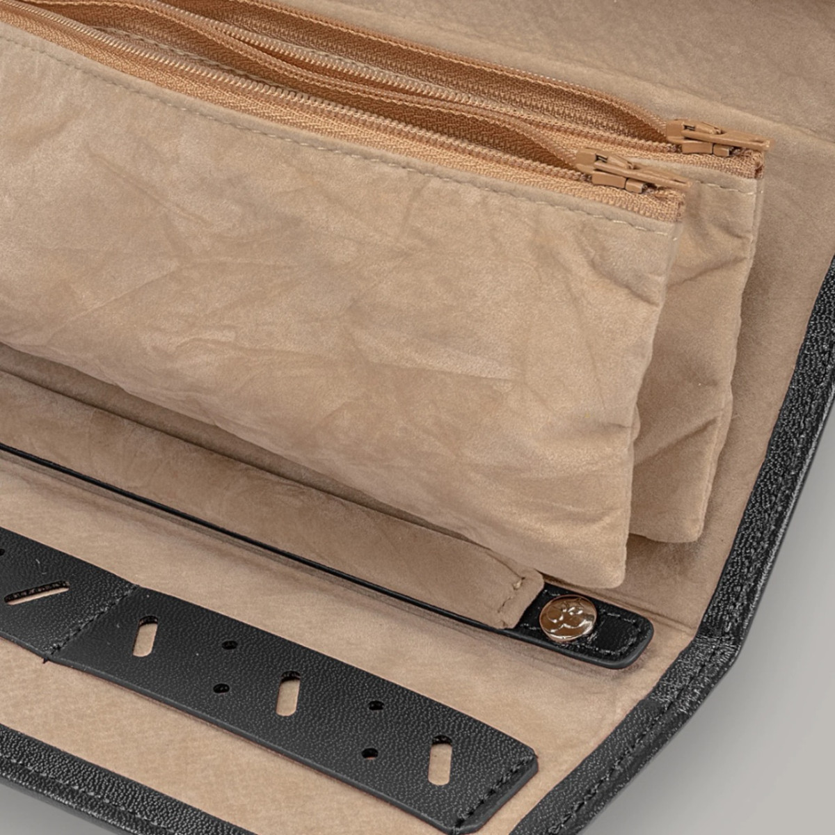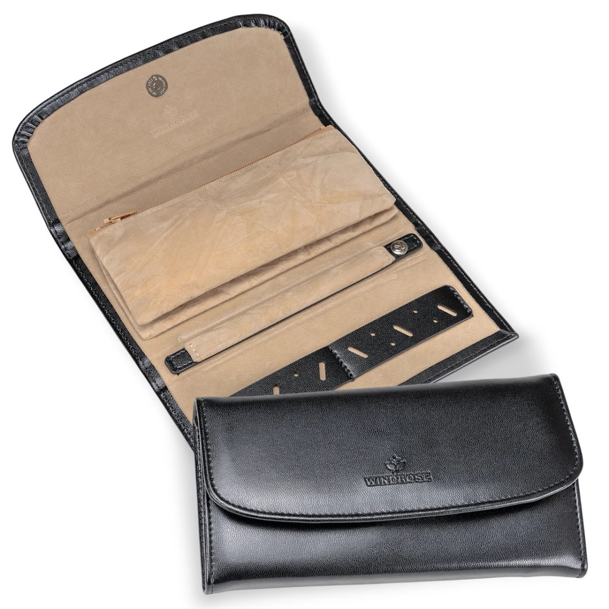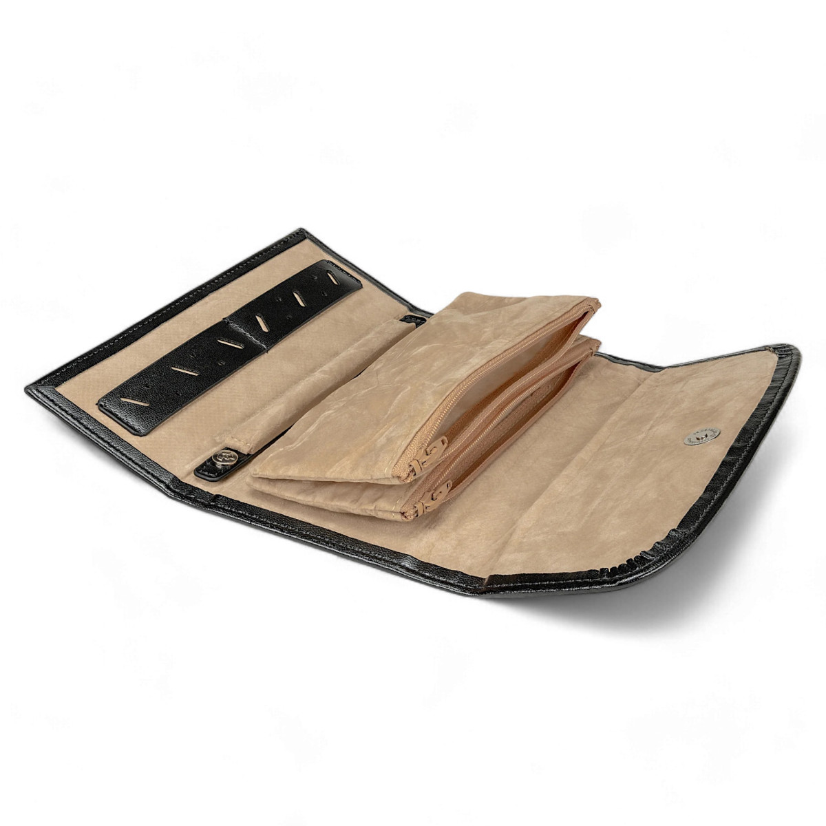 Κομψή θήκη κοσμημάτων ιδανική για ταξίδι ή χρηματοκιβώτιο. Ασφαλής και πρακτική αποθήκευση κοσμημάτων. Είτε σε επαγγελματικά ταξίδια είτε στο σπίτι, τα κοσμήματά σας είναι πάντα τέλεια προστατευμένα. Οικολογικό δέρμα.