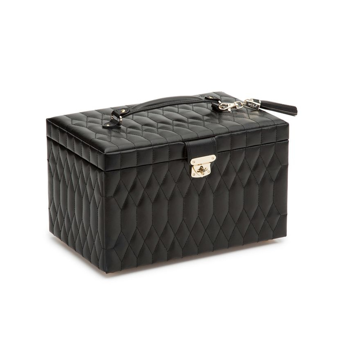 Θήκη κοσμημάτων σε μαύρο χρώμα. Η ενσάρκωση της κομψότητας και του στυλ. Διαχρονικά κλασική με κομψές απαλές γραμμές, καπιτονέ δέρμα και χρυσές λεπτομέρειες.