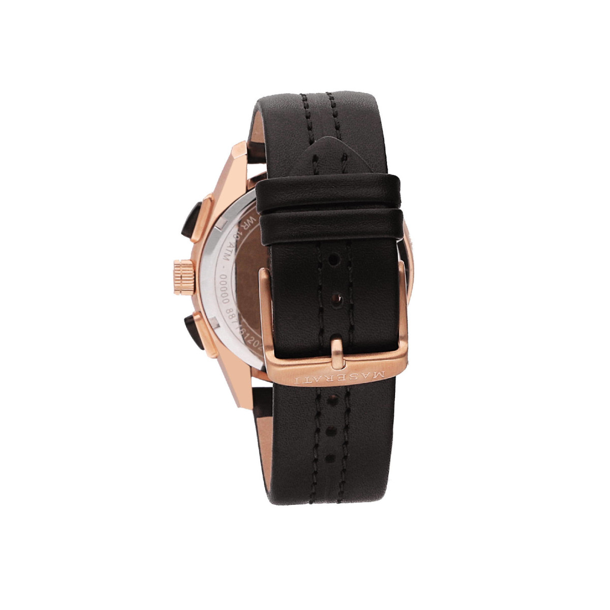 Ανδρικό ρολόι MASERATI διαμέτρου 45mm, με μηχανισμό Quartz χρονογράφου ακριβείας. Έχει μπλε καντράν με επιχρυσωμένους ροζ χρυσούς δείκτες, λεπτομέρειες και ένδειξη ημερομηνίας. Η κάσα του είναι από rose gold PVD. Έχει δερμάτινο λουράκι καφέ χρώματος.