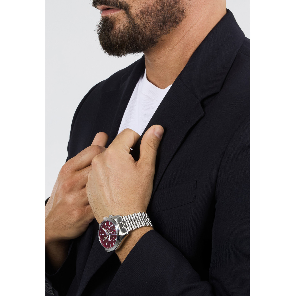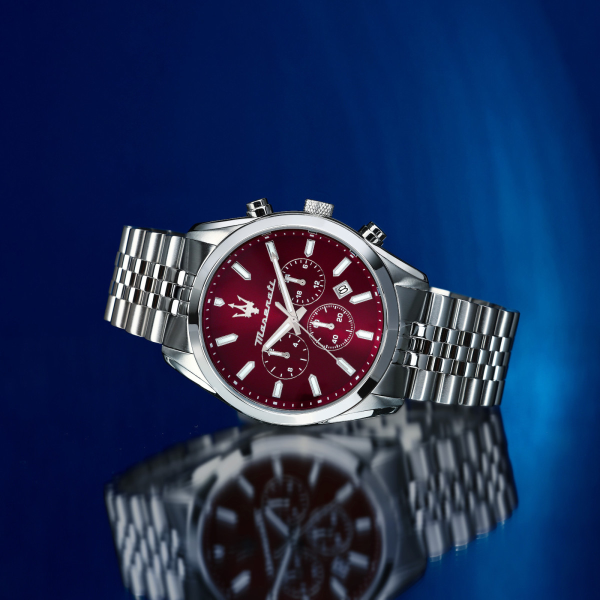 Ανδρικό ρολόι MASERATI διαμέτρου 43mm, με μηχανισμό Quartz Multi-Function ακριβείας. Έχει μπορντώ καντράν. Η κάσα του είναι από ανοξείδωτο ατσάλι. Έχει μπρασελέ από ανοξείδωτο ατσάλι.