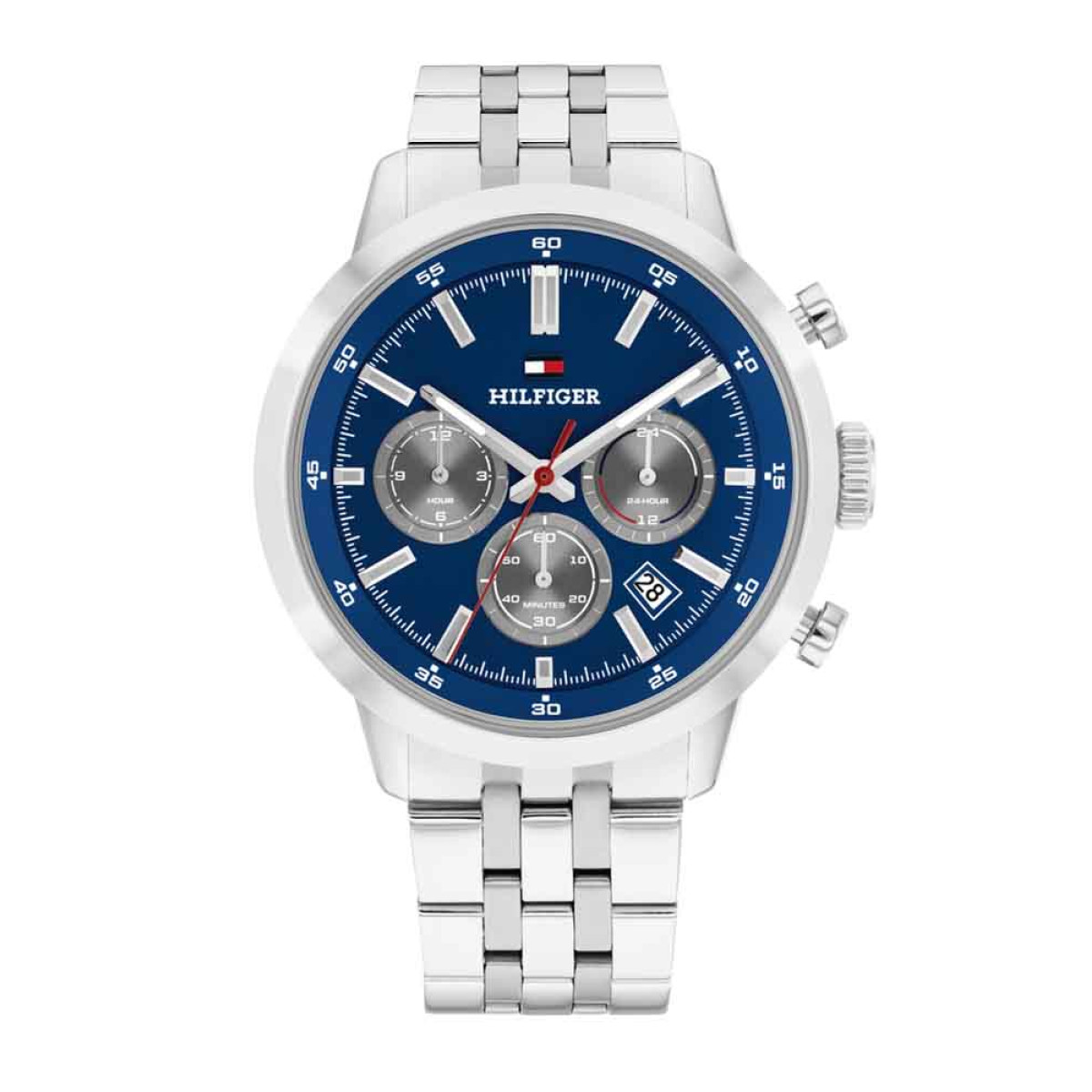 Ένα ρολόι της Tommy Hilfiger με ατσάλινη ανοξείδωτη κάσα 43mm και μπρασελέ επίσης σε ανοξείδωτο ατσάλι. Το καντράν έχει μπλε χρώμα.