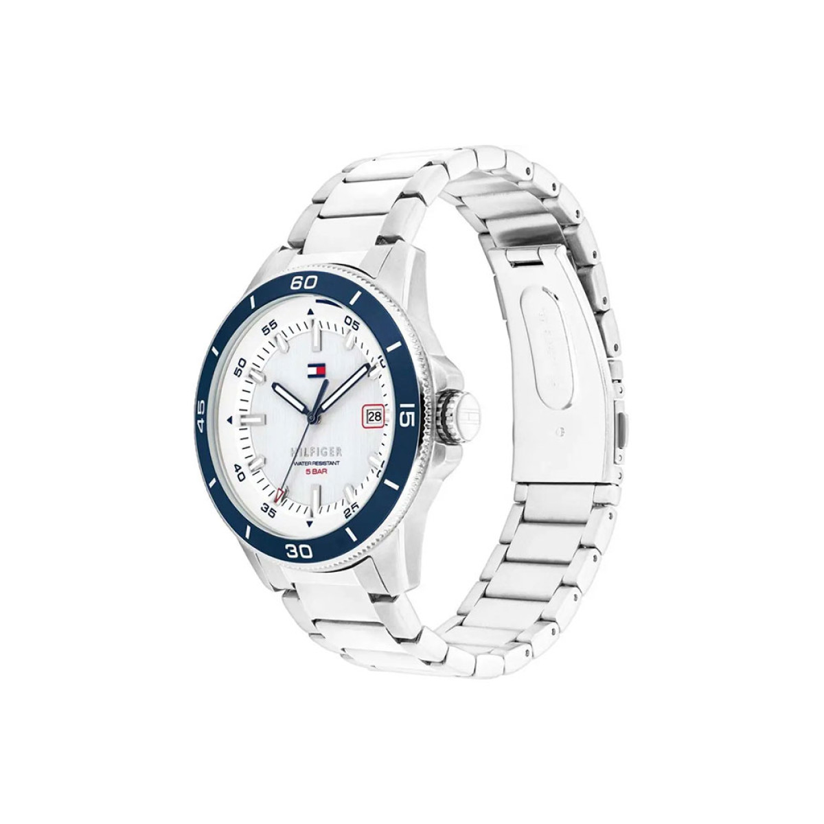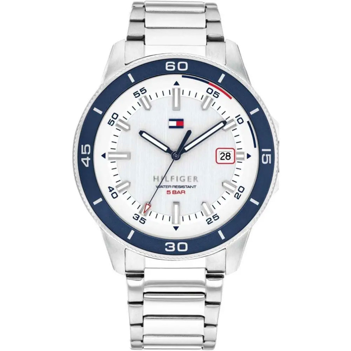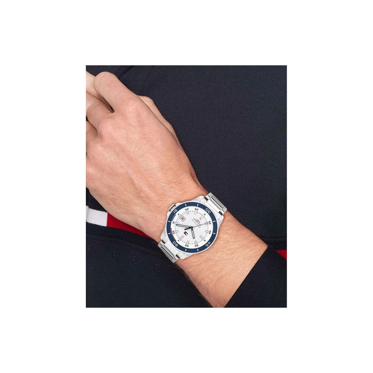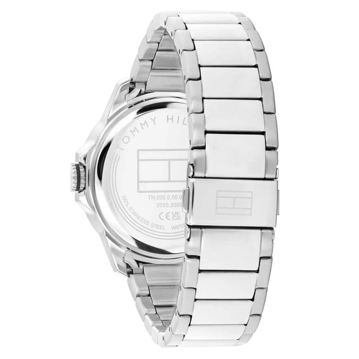 Ένα ρολόι της Tommy Hilfiger με ατσάλινη ανοξείδωτη κάσα 44mm και μπρασελέ επίσης σε ανοξείδωτο ατσάλι. Το καντράν έχει άσπρο χρώμα.