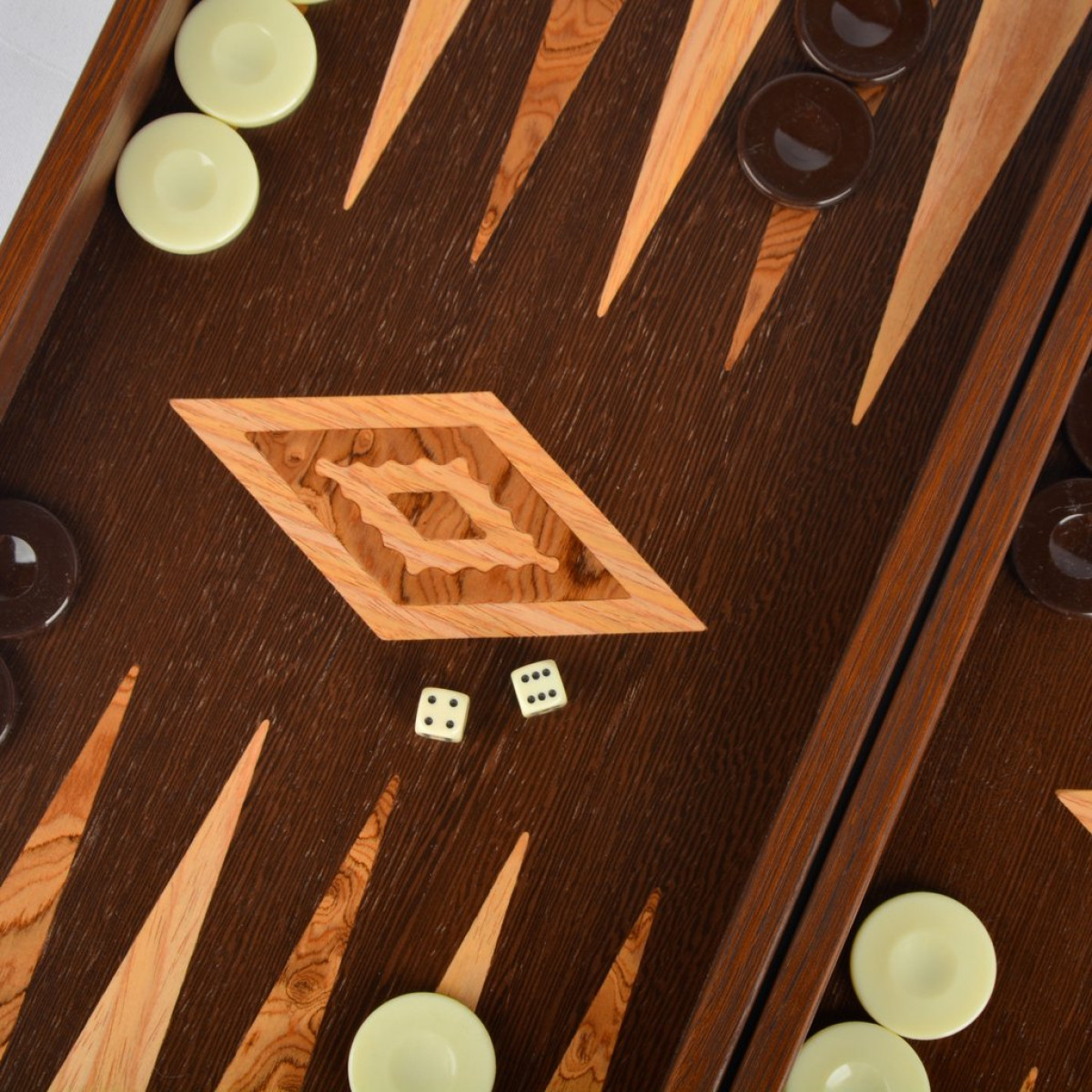 Το τάβλι αυτό είναι ένας συνδυασμός Wenge με καρυδιά. Αυτό το τάβλι είναι χειροποίητο χρησιμοποιώντας την τέχνη της marqueterie για να σχηματιστούν διακοσμητικά σχέδια στο εσωτερικό του τάβλι. 30 πούλια και 2 ζάρια.