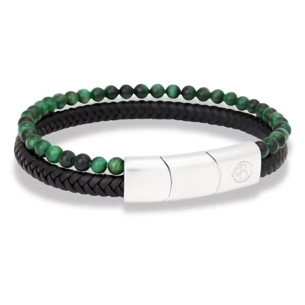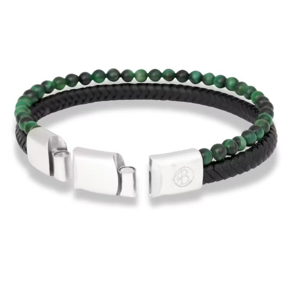 Ανδρικό βραχιόλι με μαύρο δέρμα, ημιπολύτιμους λίθους και λεπτομέρειες από ανοξείδωτο ατσάλι. Αυξομείωση μεγέθους.