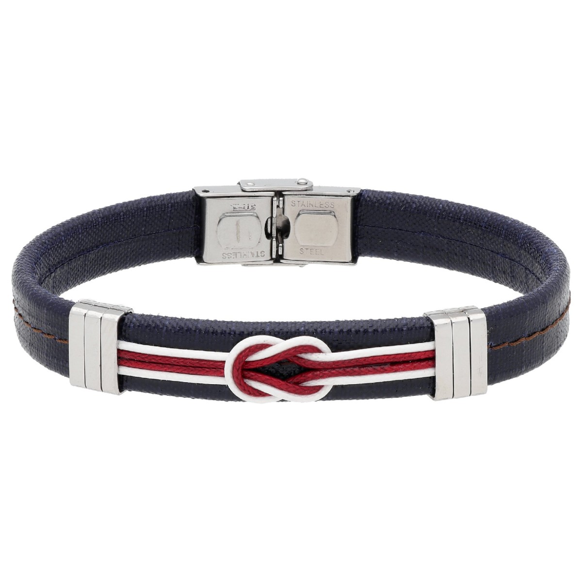 Ανδρικό βραχιόλι με μπλε δέρμα και άσπρο και κόκκινο κορδόνι και λεπτομέρειες από ανοξείδωτο ατσάλι. Αυξομείωση μεγέθους.