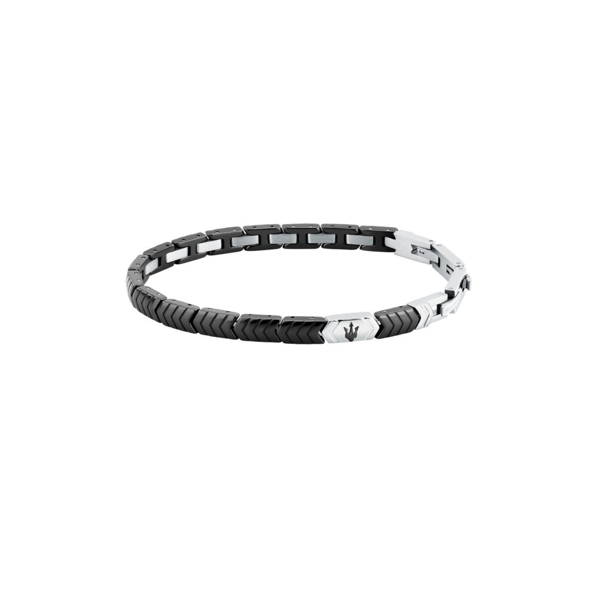Ανδρικό βραχιόλι MASERATI από ανοξείδωτο ατσάλι με κεραμικά στοιχεία,μαύρου και ασημένιου χρώματος με μαύρη τρίαινα και λογότυπο. Αυξομείωση μεγέθους.