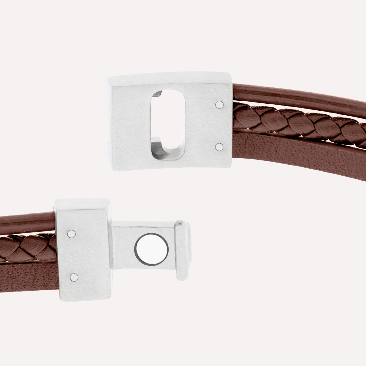 Ανδρικό βραχιόλι με καφέ δέρμα και λεπτομέρειες από ανοξείδωτο ατσάλι.