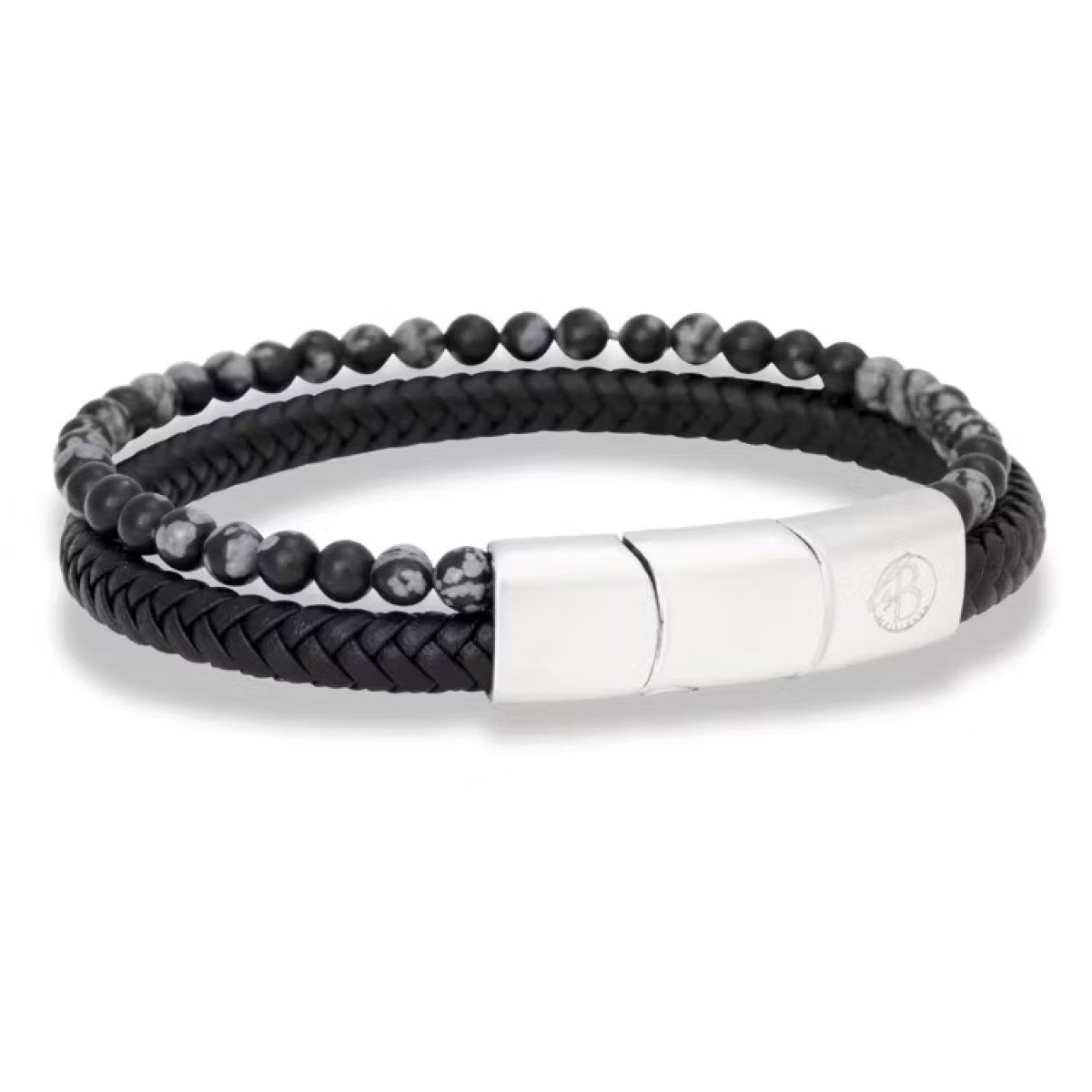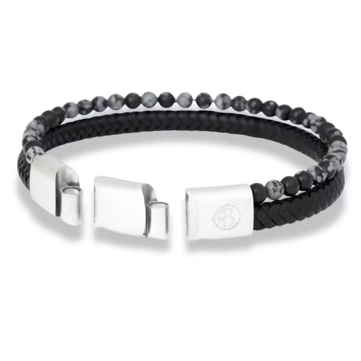 Ανδρικό βραχιόλι με μαύρο δέρμα, ημιπολύτιμους λίθους και λεπτομέρειες από ανοξείδωτο ατσάλι. Αυξομείωση μεγέθους.