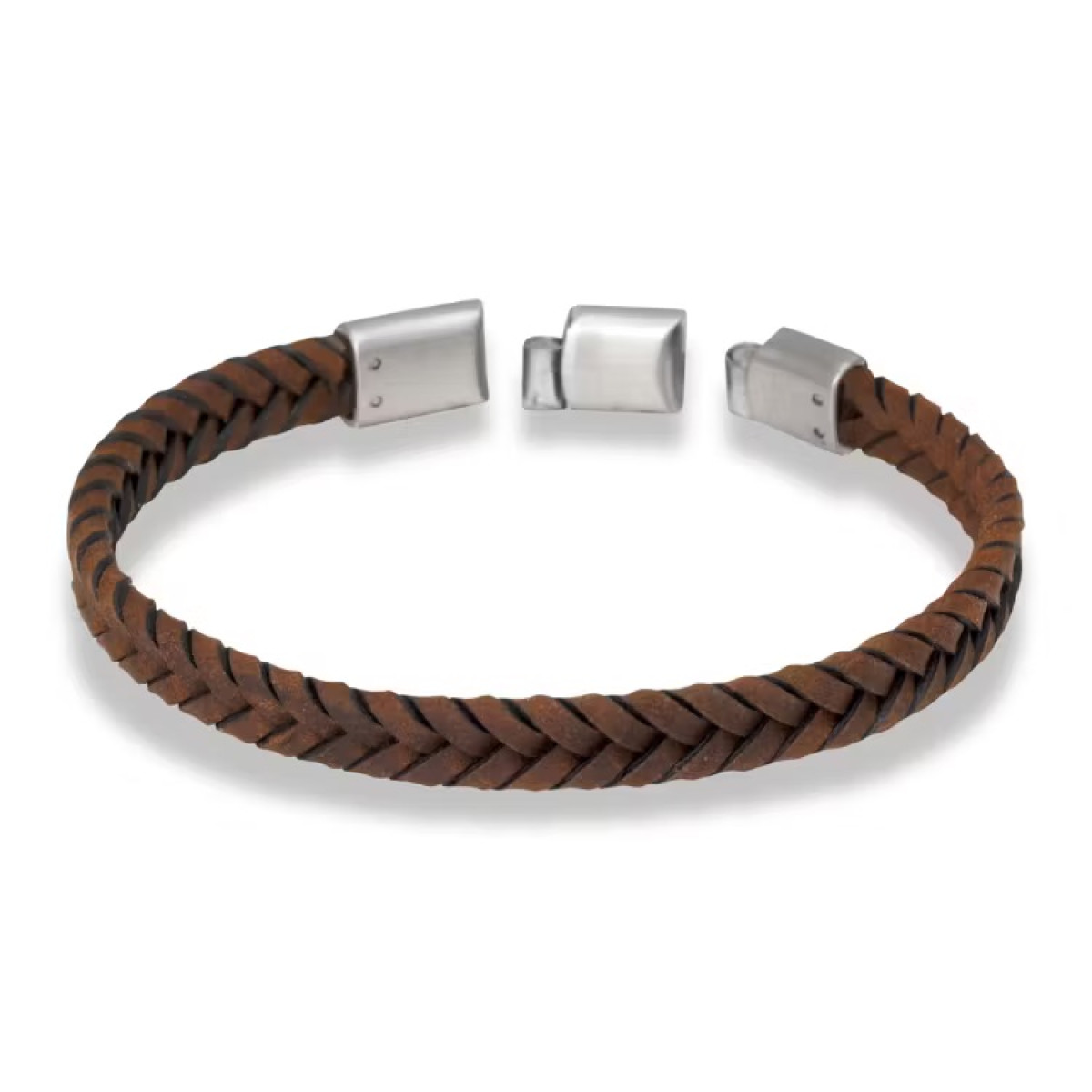 Ανδρικό βραχιόλι με καφέ δέρμα και λεπτομέρειες από ανοξείδωτο ατσάλι. Αυξομείωση μεγέθους.