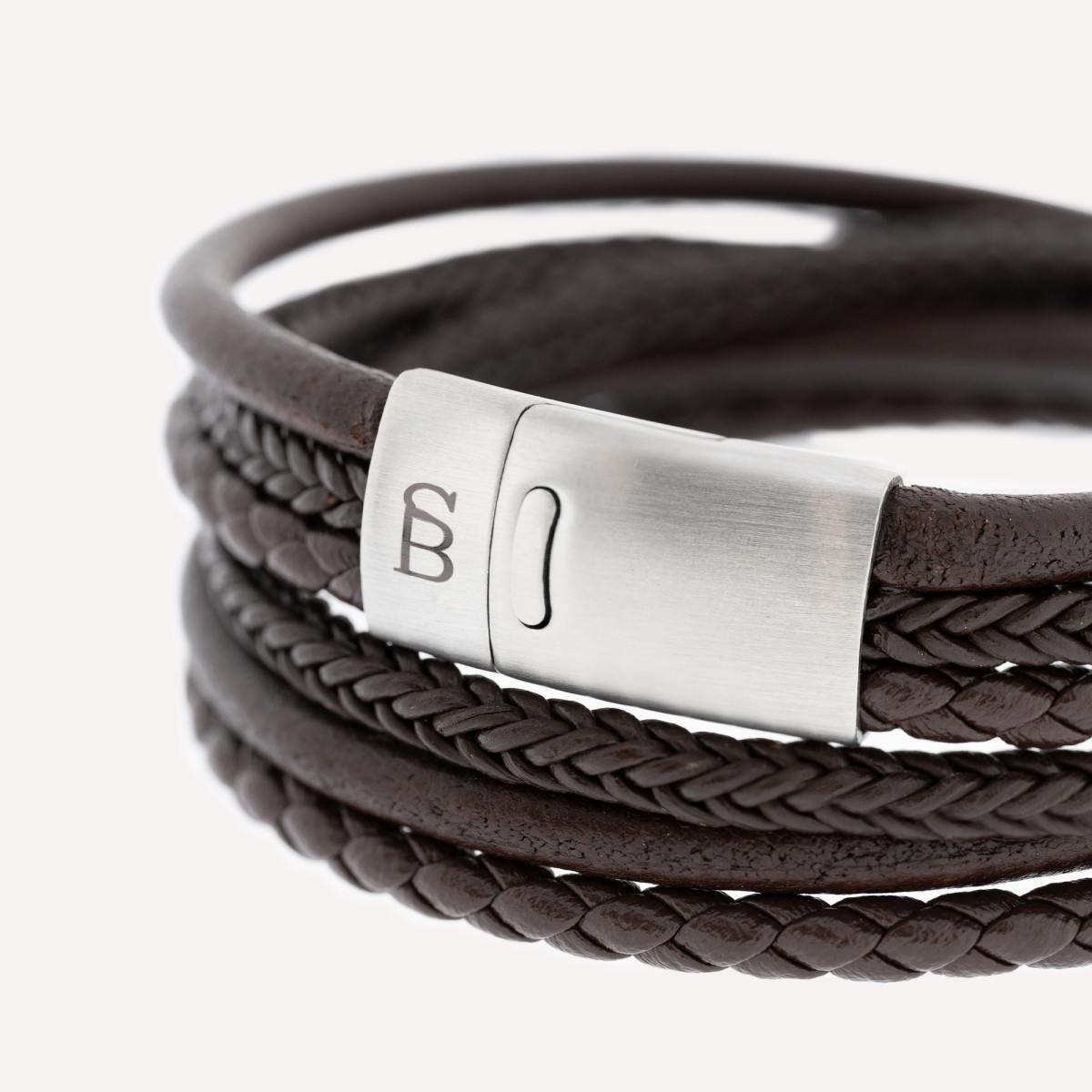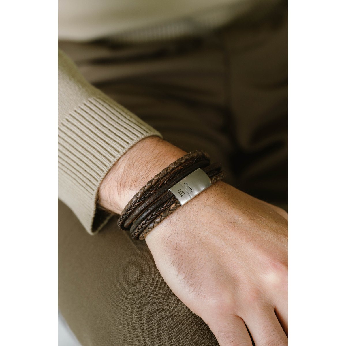 Ανδρικό βραχιόλι με καφέ δέρμα και λεπτομέρειες από ανοξείδωτο ατσάλι.
