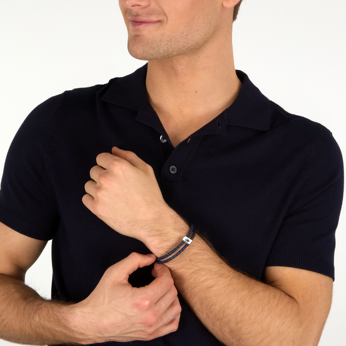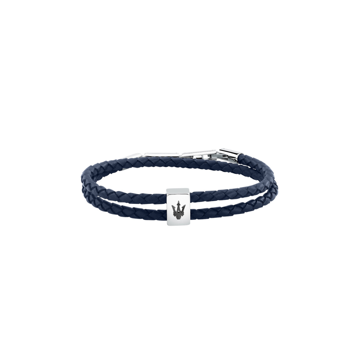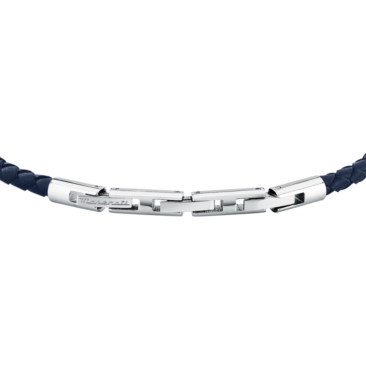 Ανδρικό βραχιόλι MASERATI με μπλε δερμάτινο λουράκι. To βραχιόλι έχει το λογότυπο της εταιρείας και ασημένιες λεπτομέρειες από ανοξείδωτο ατσάλι. Αυξομείωση μεγέθους. (38+3cm)- Κατασκευαστής: MASERATI