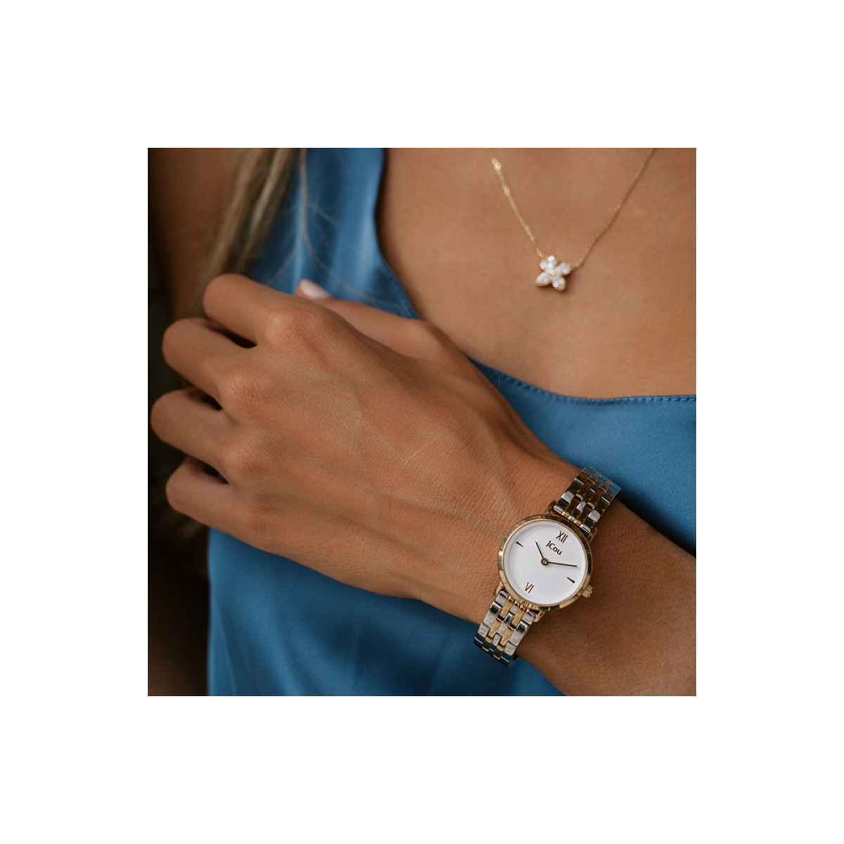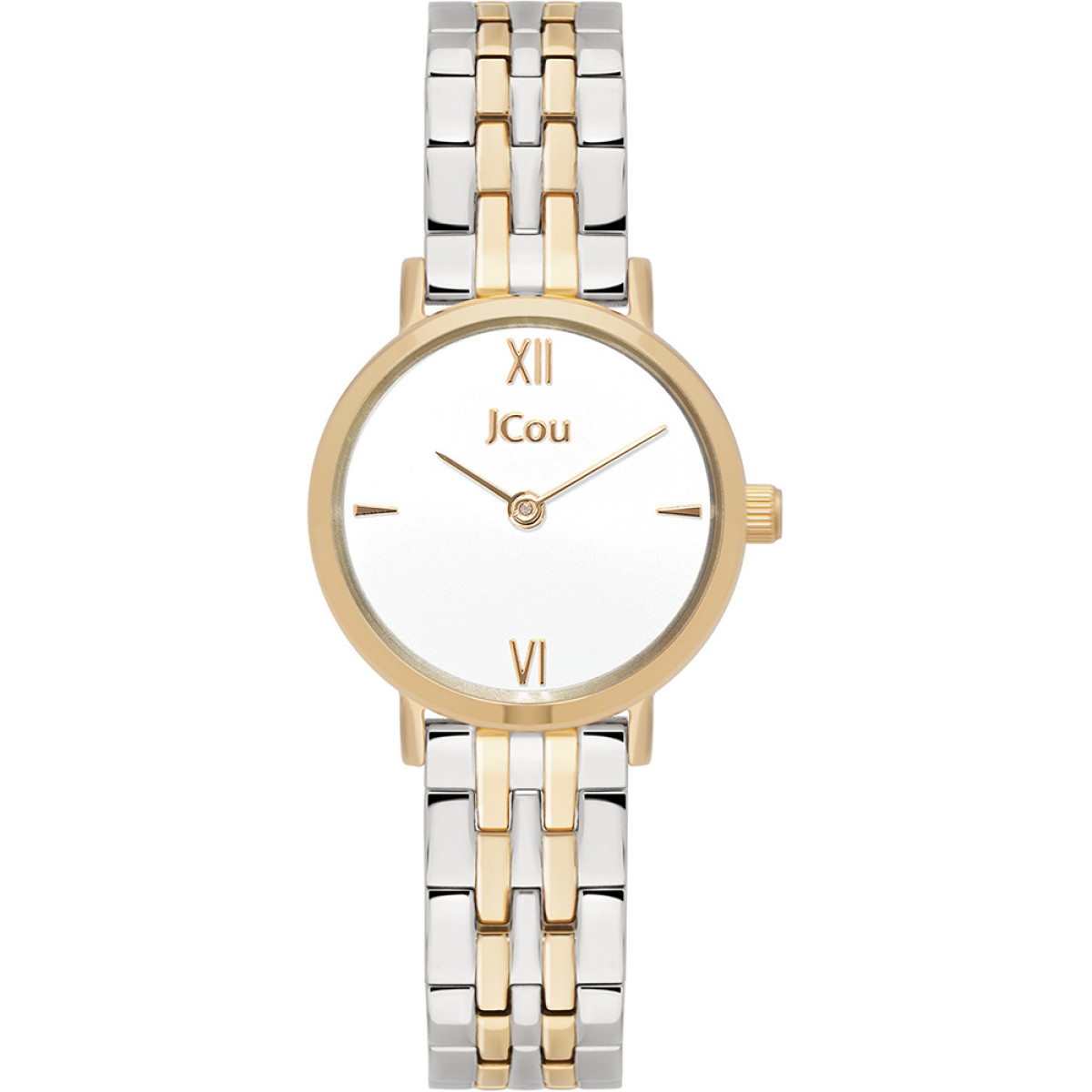 Γυναικείο ρολόι JCOU  διαμέτρου 26mm με μηχανισμό QUARTZ ακριβείας. Έχει καντράν λευκού χρώματος με επίχρυσους δείκτες – λεπτομέρειες. Η κάσα του είναι επίχρυση από ανοξείδωτο ατσάλι με κρύσταλλο από ορυκτό κρύσταλλο ειδικής σκλήρυνσης. Έχει επίχρυσο μπρασελέ από ανοξείδωτο ατσάλι και κούμπωμα ασφαλείας.