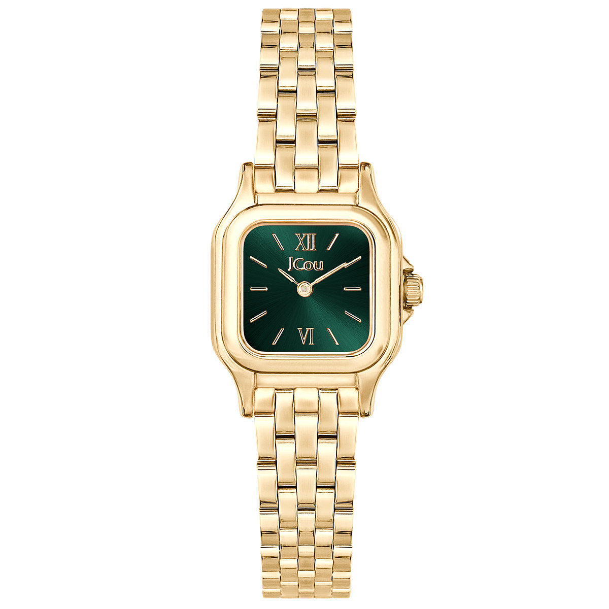Γυναικείο ρολόι JCOU διαμέτρου 22mm με μηχανισμό QUARTZ ακριβείας. Έχει καντράν πράσινου χρώματος με επίχρυσους δείκτες – λεπτομέρειες. Η κάσα του είναι επίχρυση από ανοξείδωτο ατσάλι με κρύσταλλο από ορυκτό κρύσταλλο ειδικής σκλήρυνσης. Έχει επίχρυσο μπρασελέ από ανοξείδωτο ατσάλι και κούμπωμα ασφαλείας.
