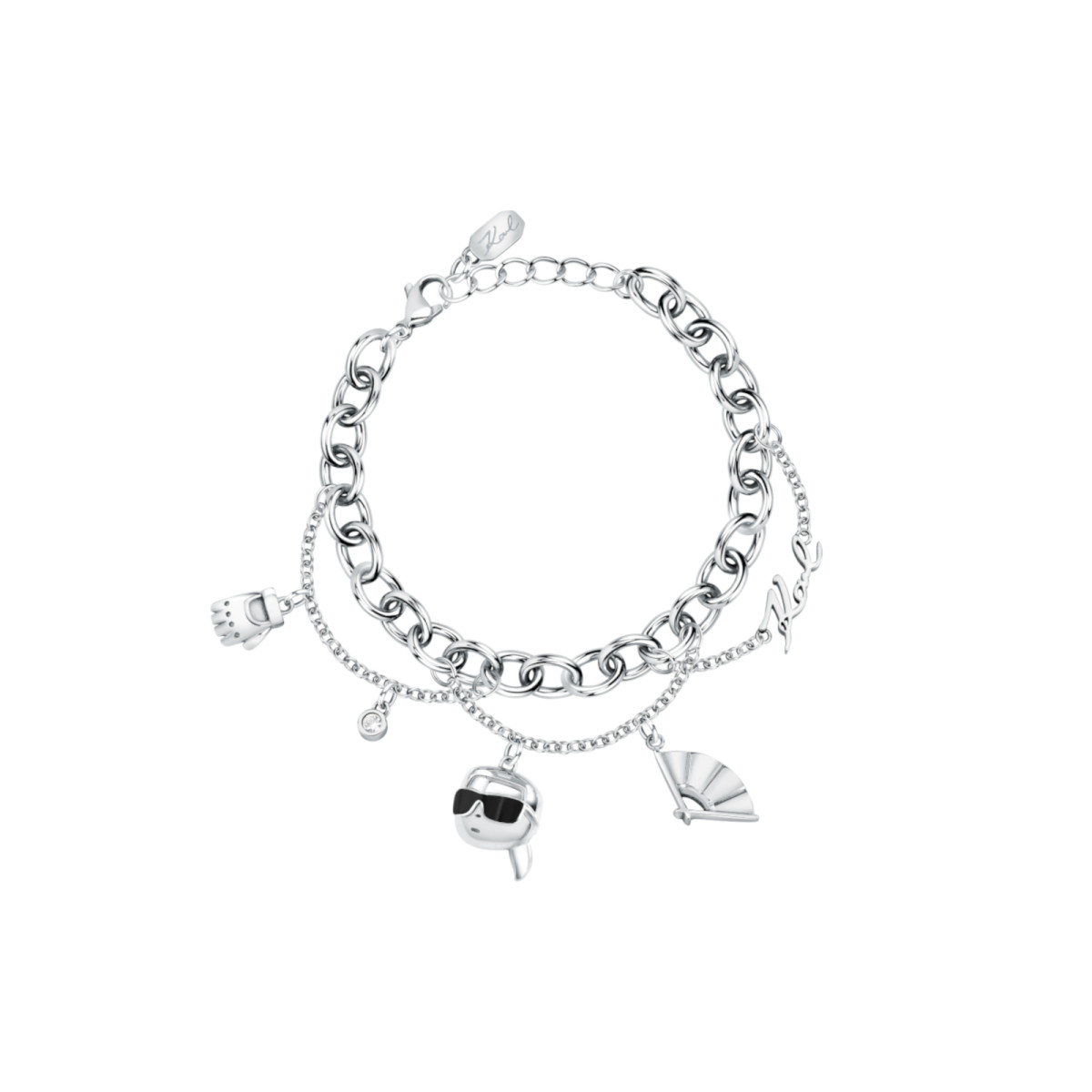 Γυναικείο βραχιόλι KARL LAGERFELD ασημένιου χρώματος. Είναι κατασκευασμένο από ανοξείδωτο ατσάλι και είναι διακοσμημένο με κρεμαστά σχέδια(16+3cm).