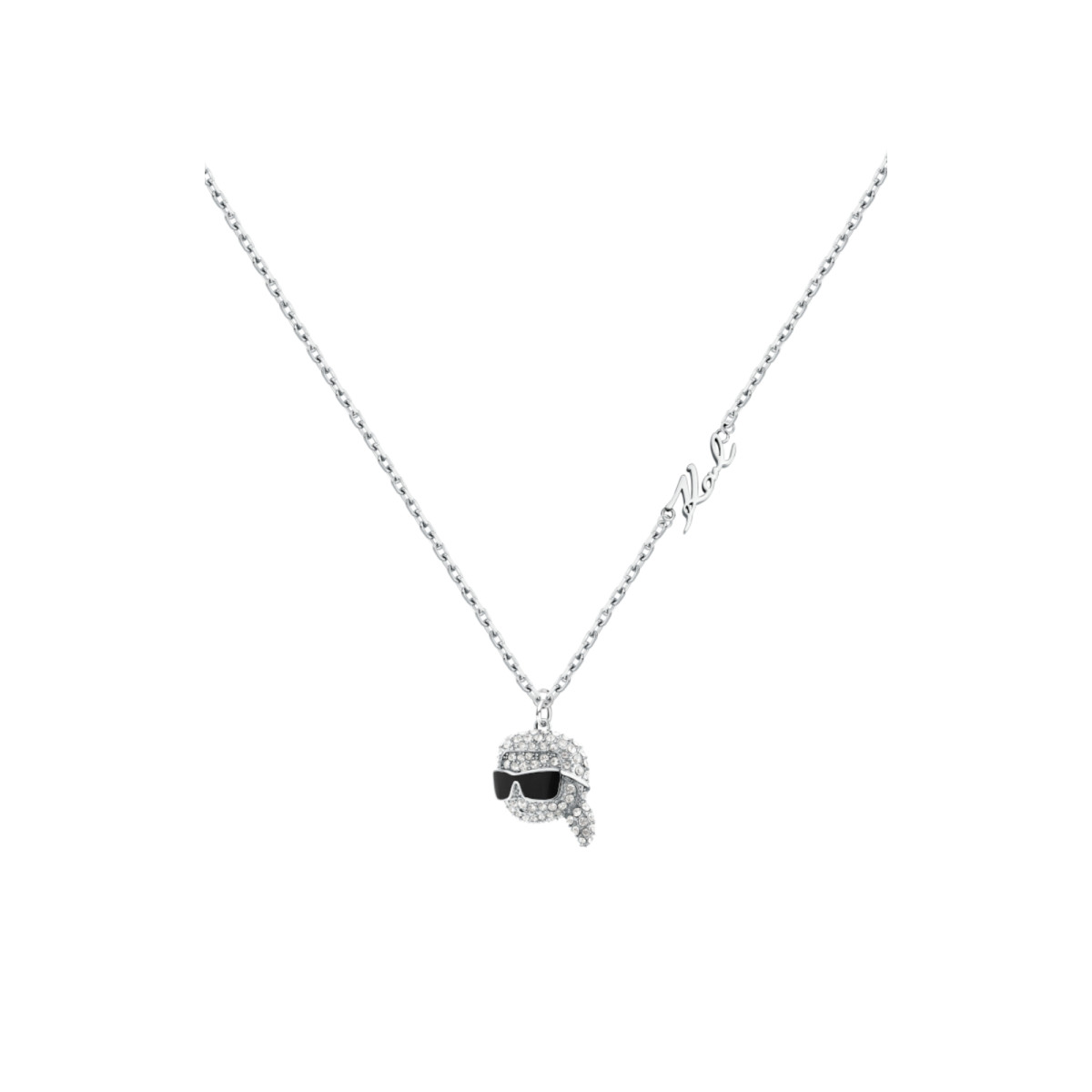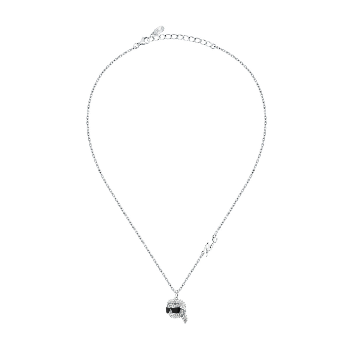 Γυναικείο κολιέ KARL LAGERFELD ασημένιου χρώματος. Είναι κατασκευασμένο από ανοξείδωτο ατσάλι και είναι διακοσμημένο με κρύσταλλα με σχέδιο και λογότυπο της εταιρείας(40+5cm).