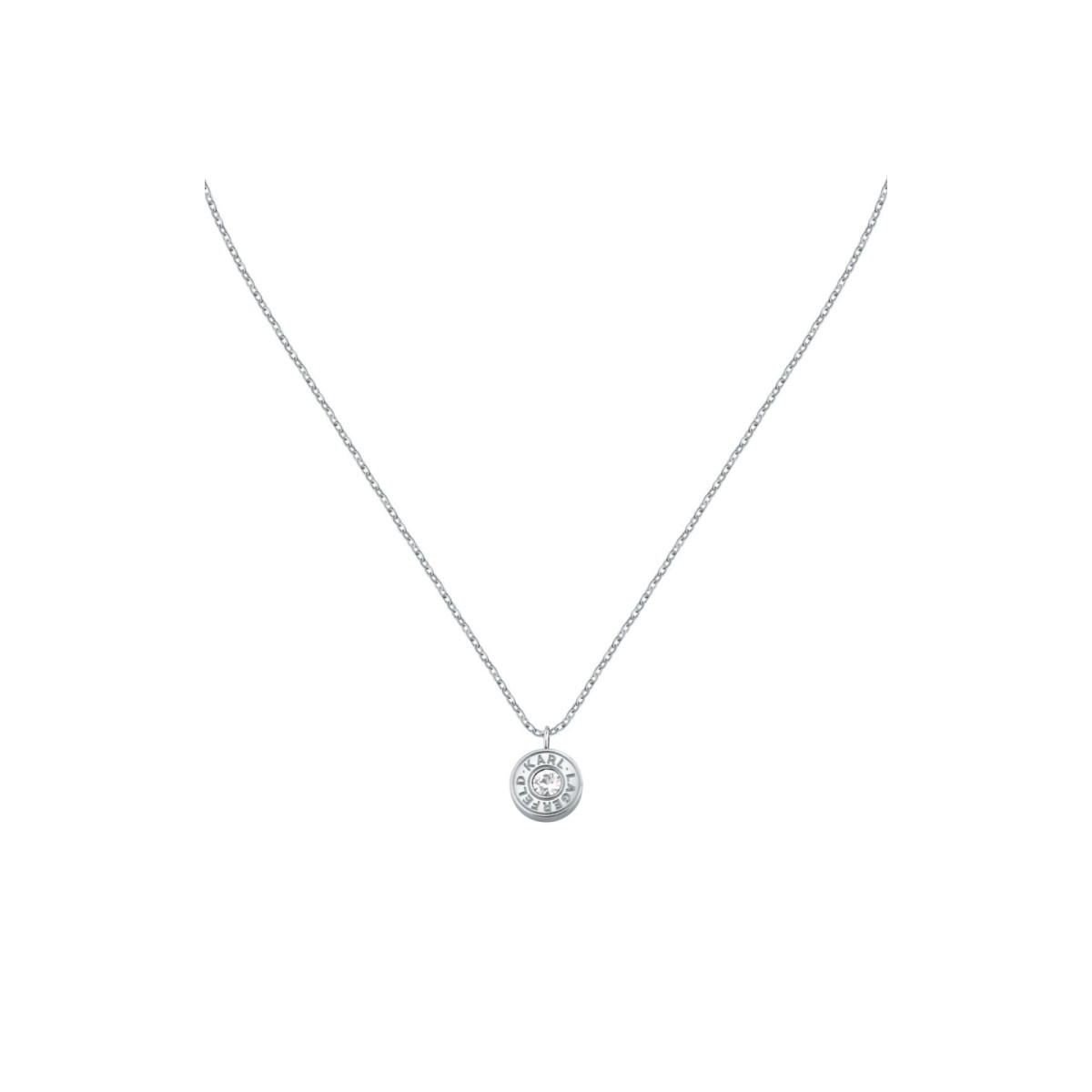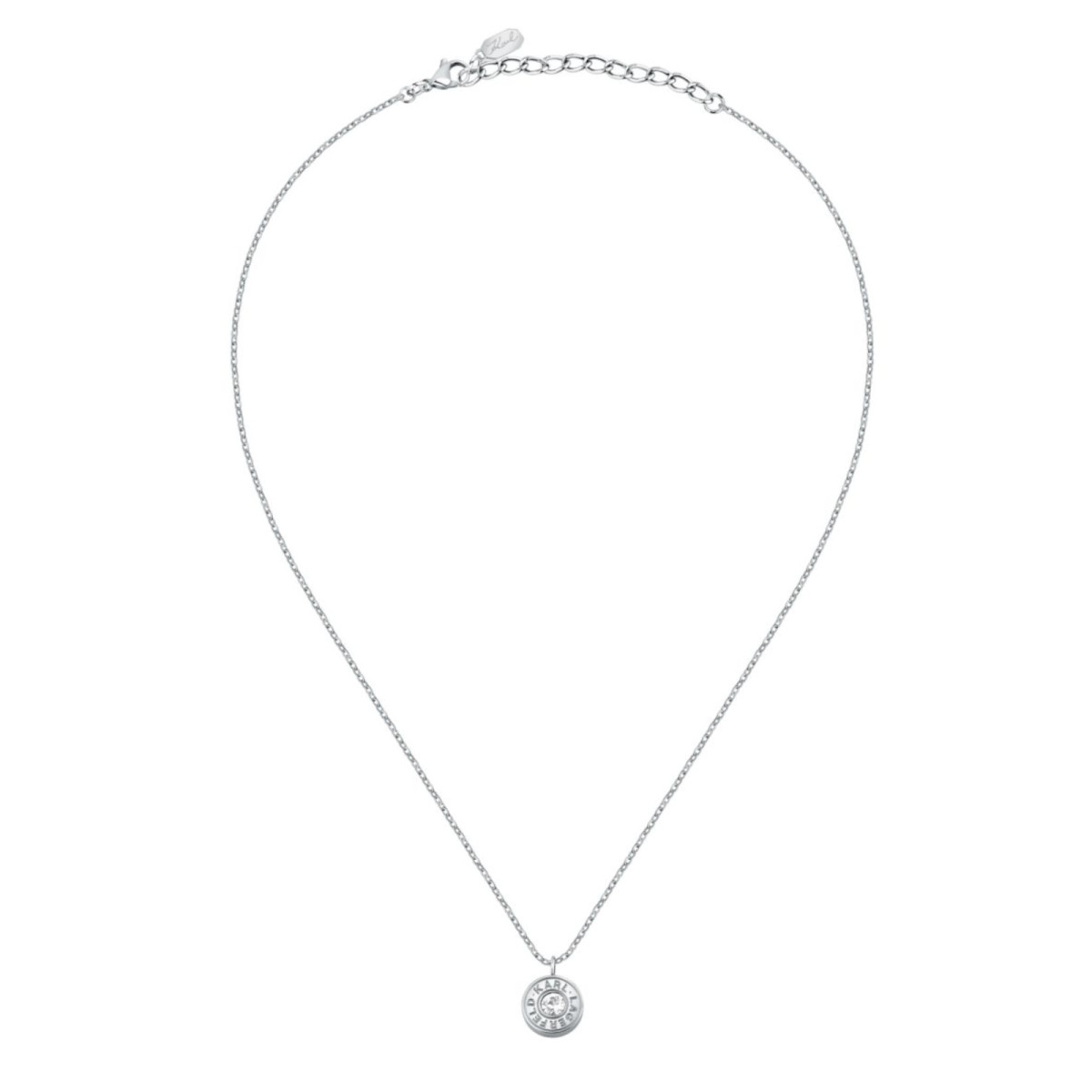 Γυναικείο κολιέ KARL LAGERFELD ασημένιου χρώματος με πέτρα. Είναι κατασκευασμένο από ανοξείδωτο ατσάλι και είναι διακοσμημένο με σχέδιο με άσπρη πέτρα και λογότυπο της εταιρείας(40+5cm).