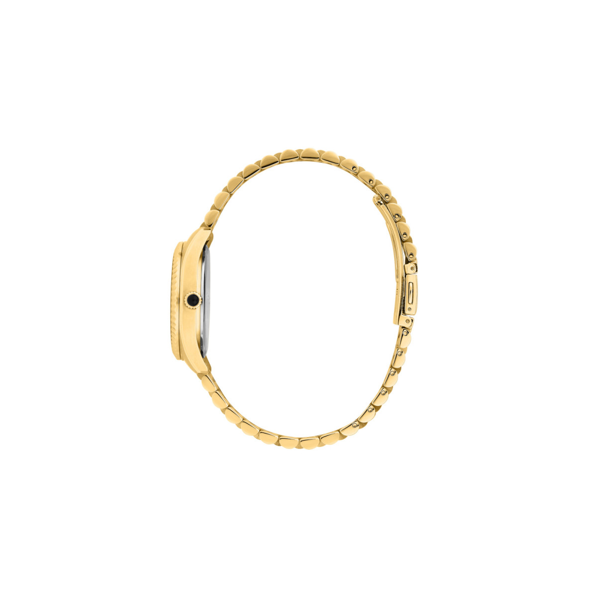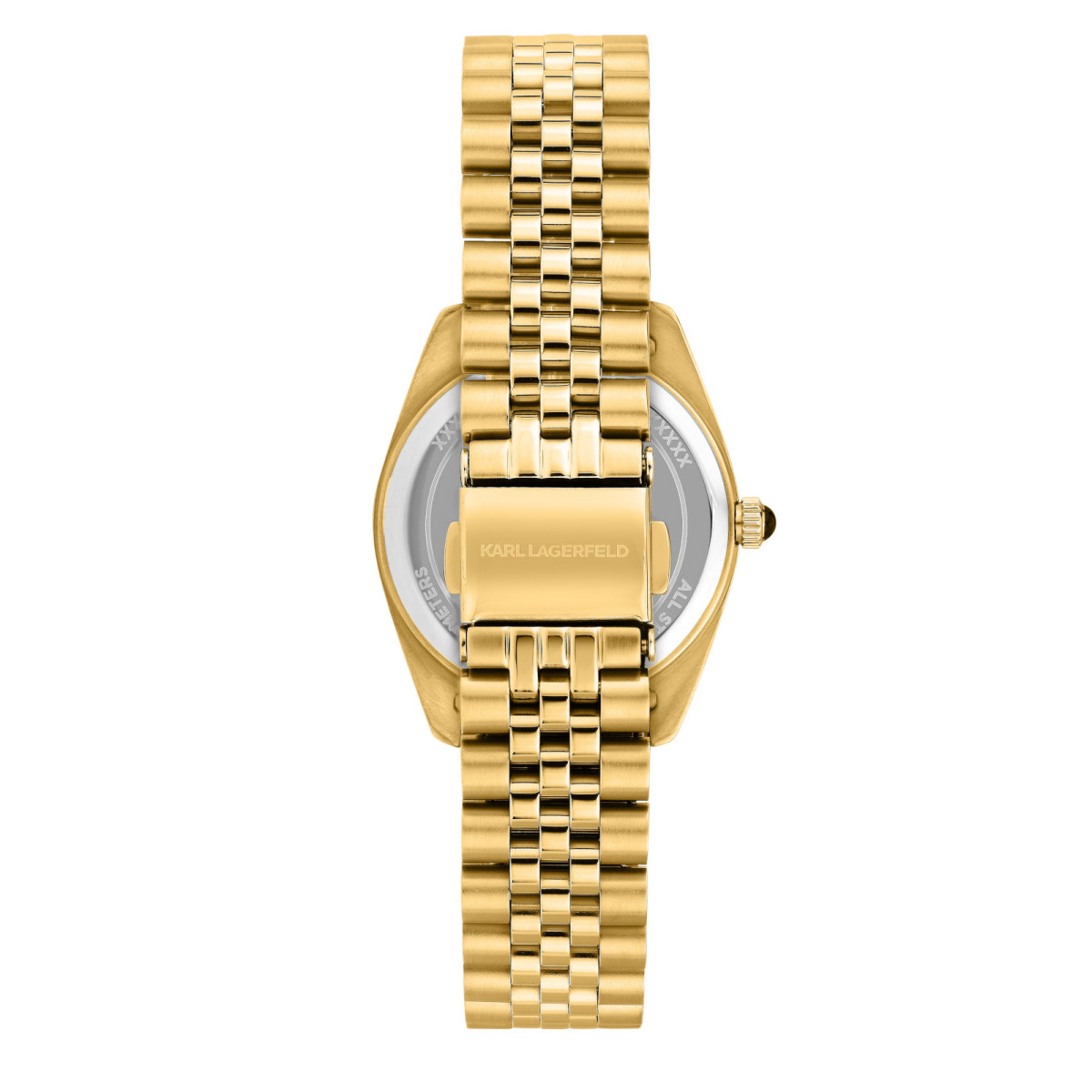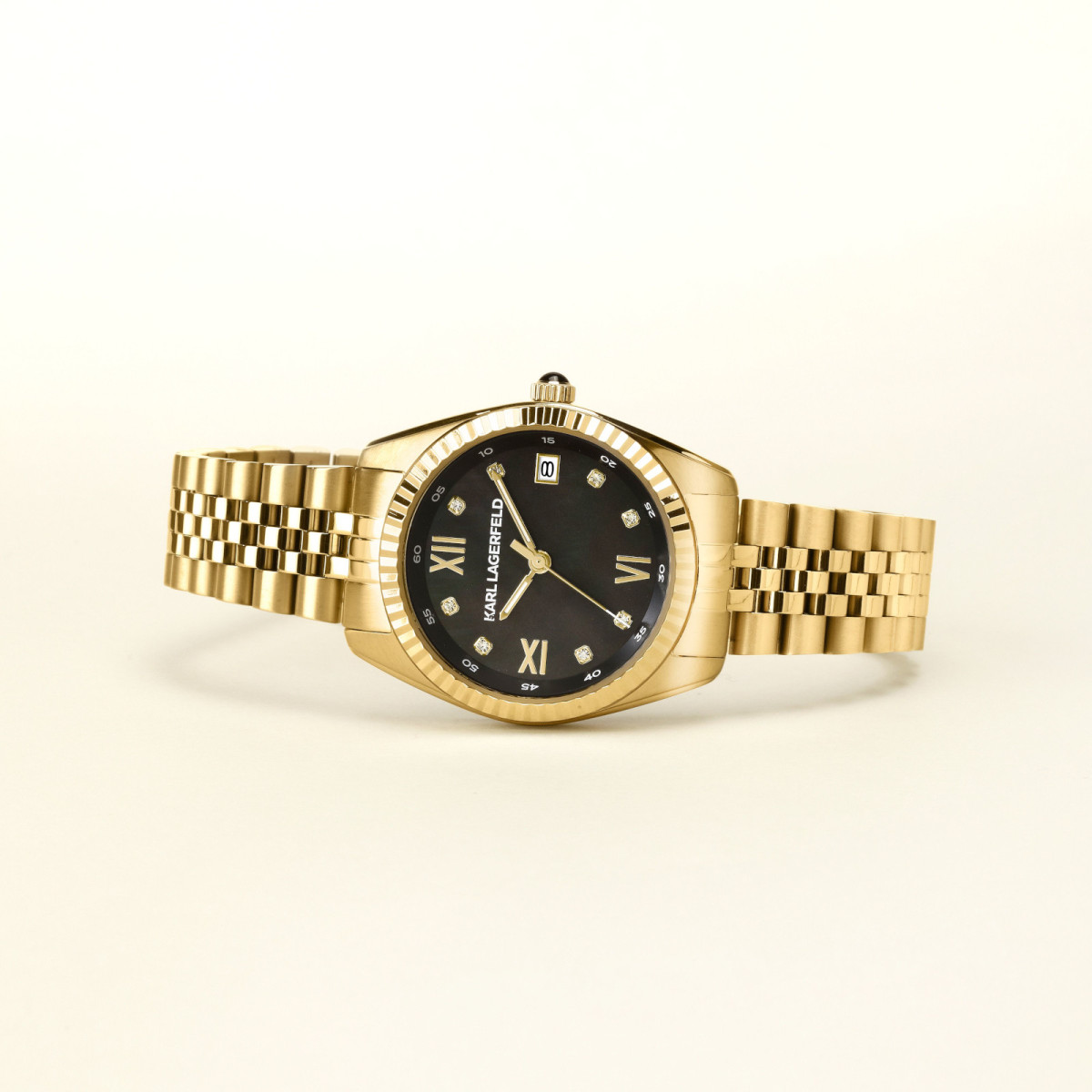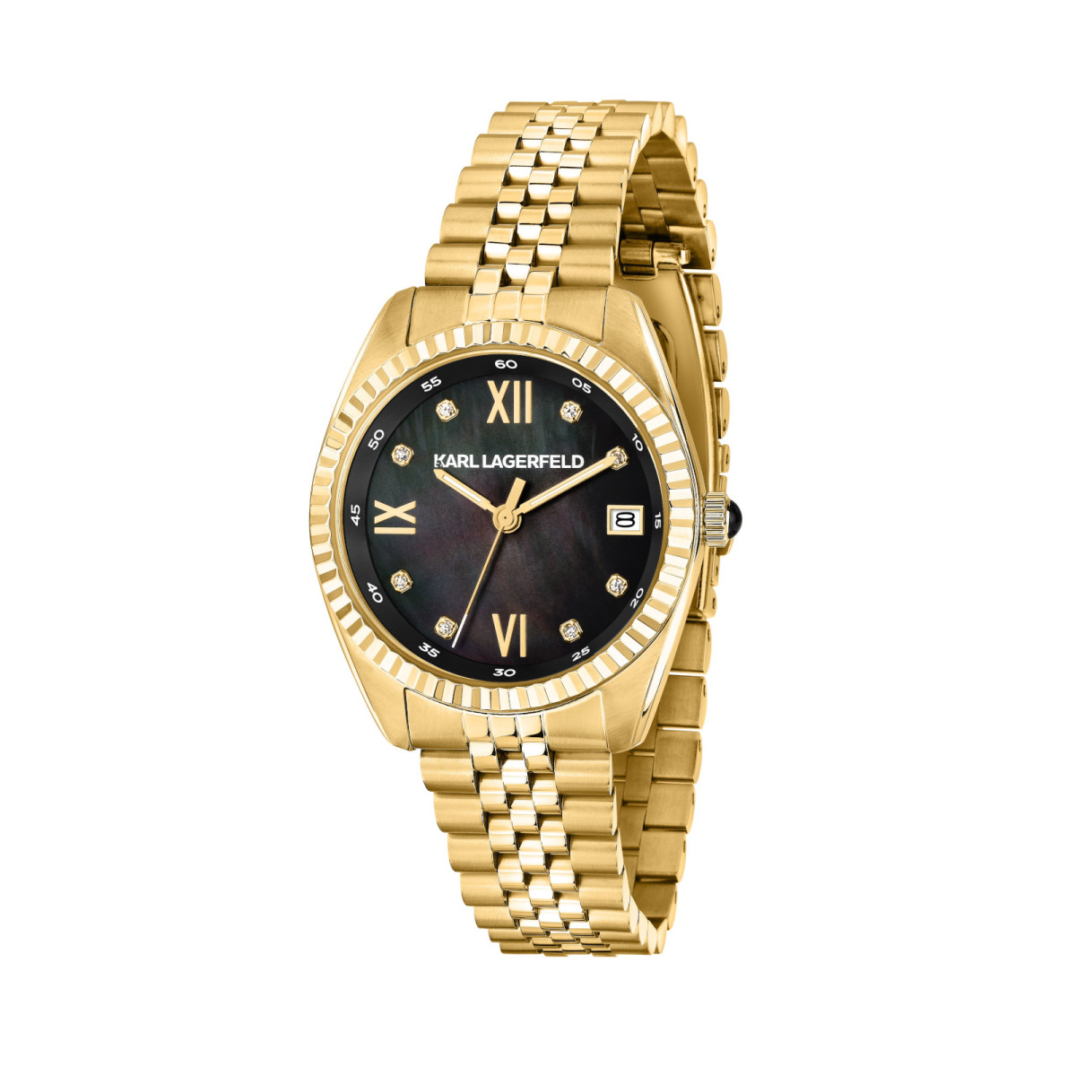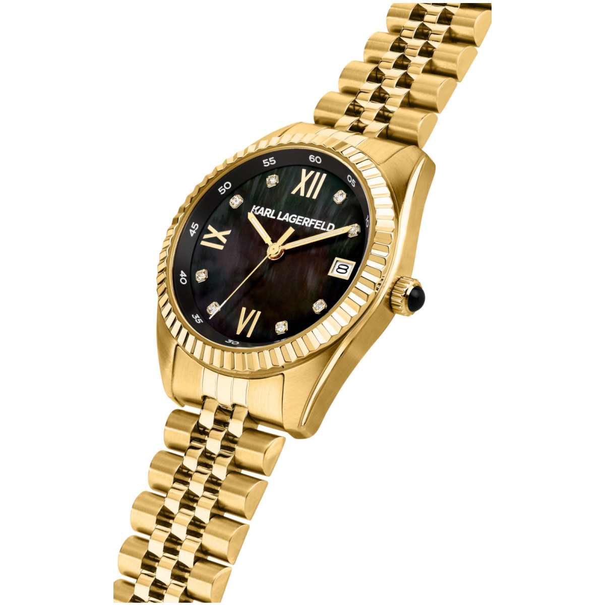 Γυναικείο ρολόι KARL LAGERFELD διαμέτρου 32mm με μηχανισμό Quartz ακριβείας. Έχει καντράν από μαύρο MOP (MOTHER OF PEARL) με χρυσούς δείκτες και λεπτομέρειες και είναι διακοσμημένο με πέτρες. Η κάσα του είναι από ανοξείδωτο ατσάλι σε χρυσό χρώμα με κρύσταλλο από ορυκτό κρύσταλλο. Έχει μπρασελέ από ανοξείδωτο ατσάλι σε χρυσό χρώμα και κούμπωμα ασφαλείας.