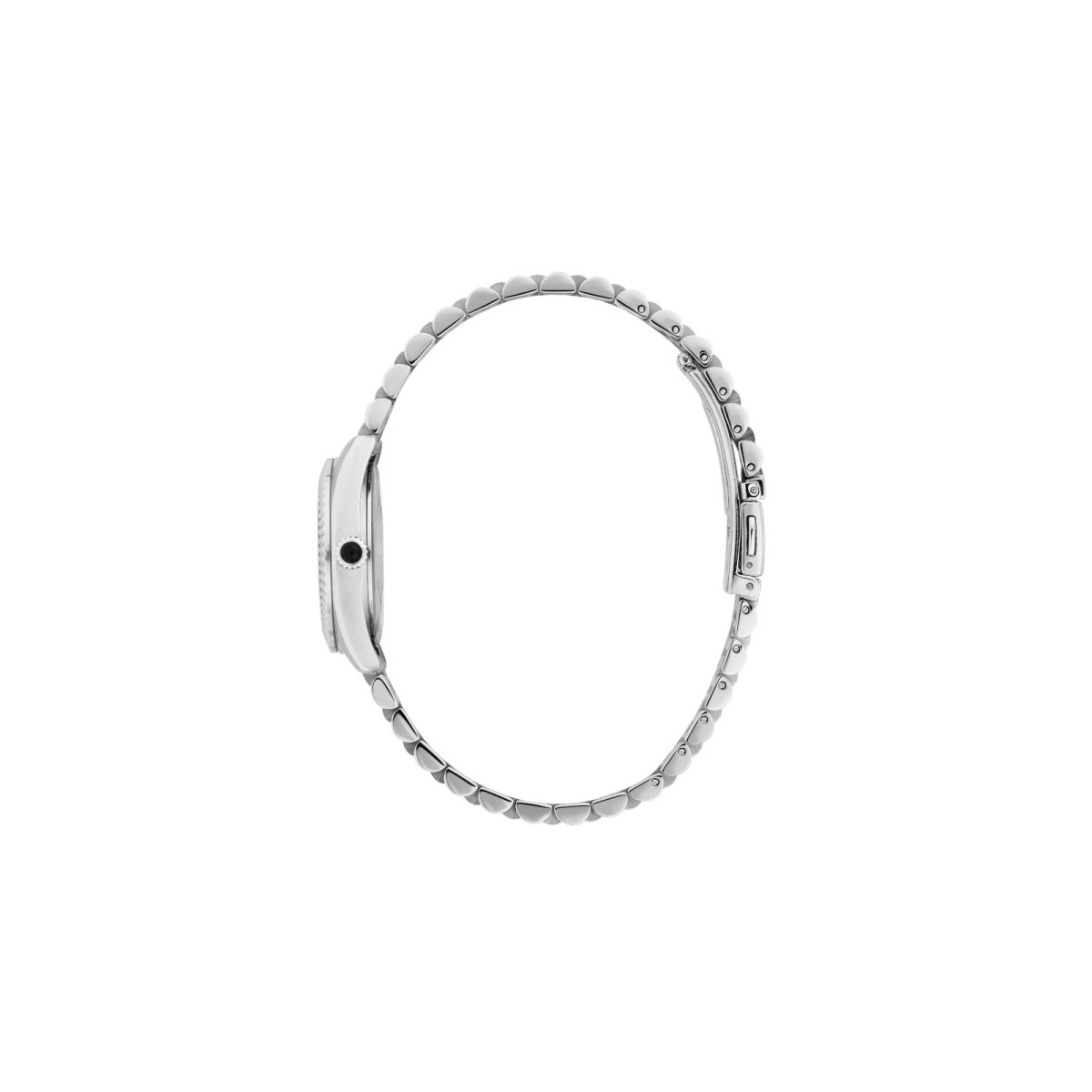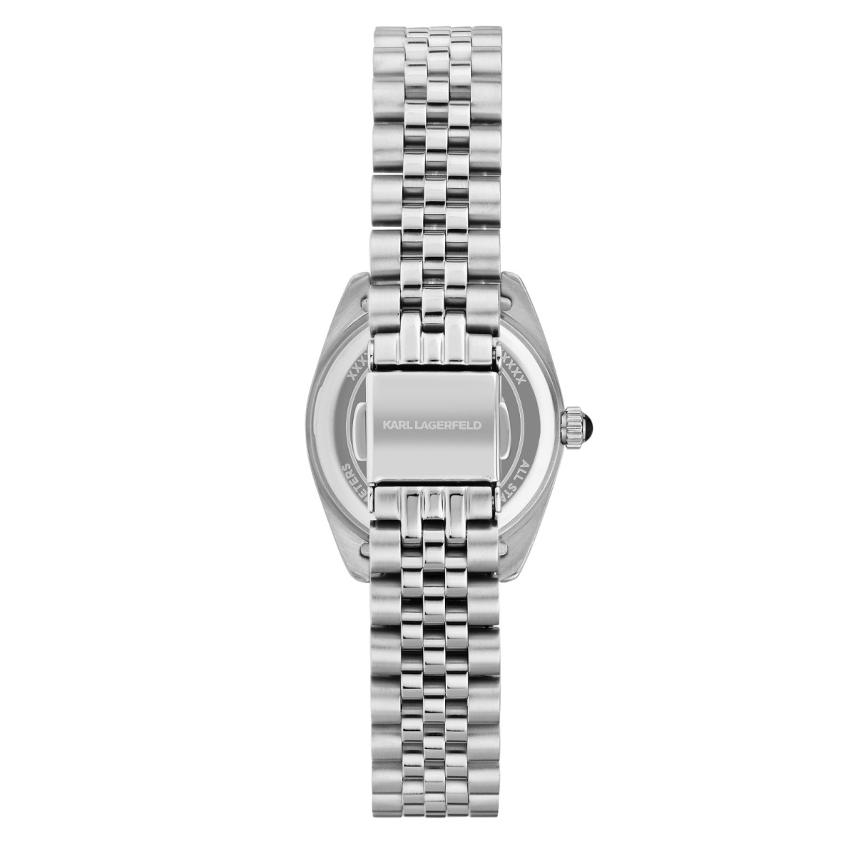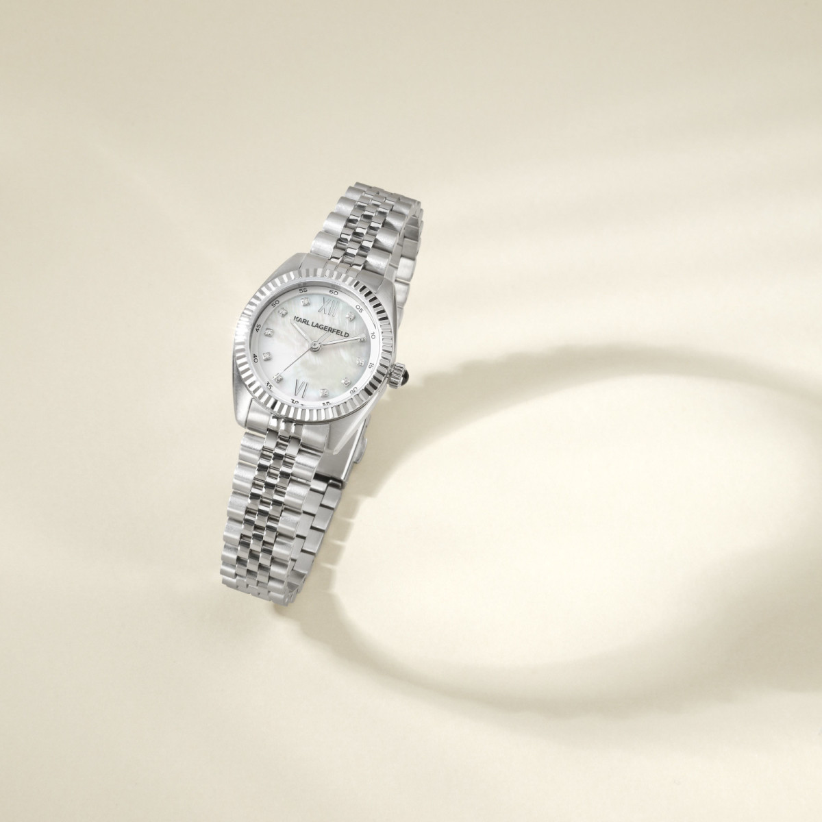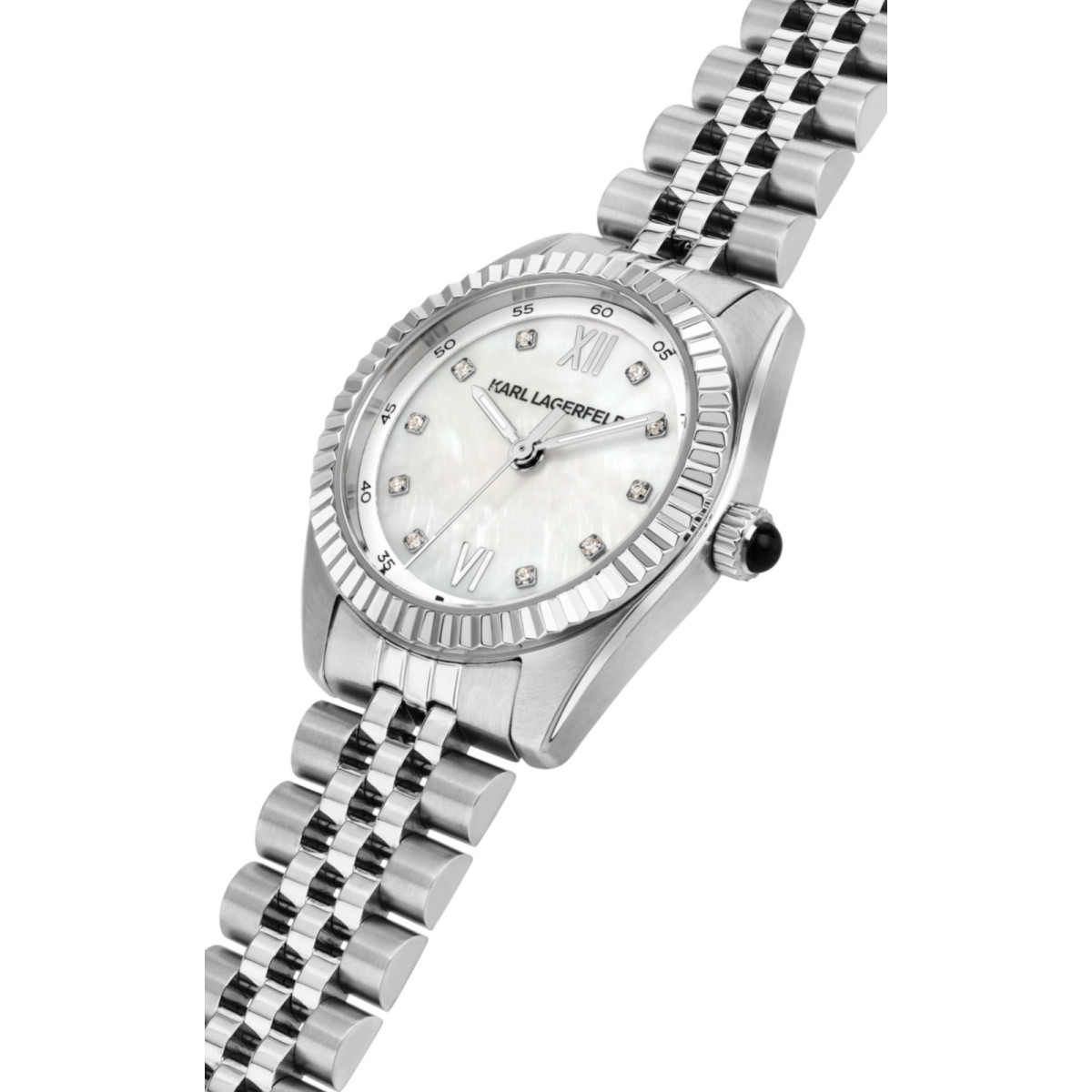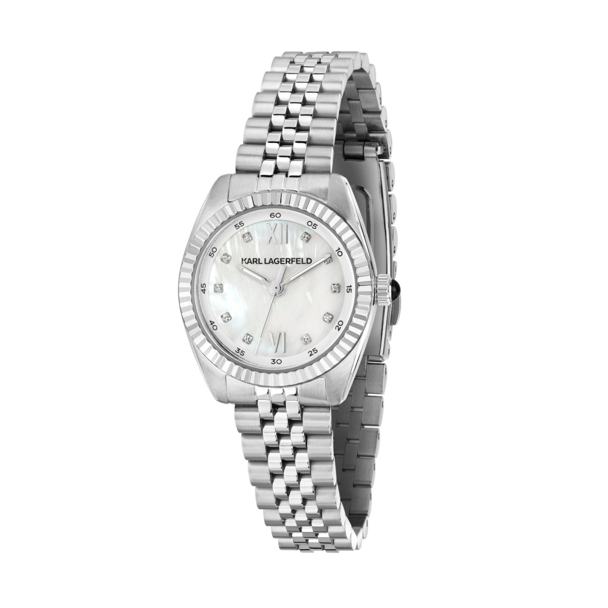 Γυναικείο ρολόι KARL LAGERFELD διαμέτρου 28mm με μηχανισμό Quartz ακριβείας. Έχει καντράν  με MOP (MOTHER OF PEARL) με ασημί δείκτες και λεπτομέρειες και είναι διακοσμημένο με πέτρες. Η κάσα του είναι από ανοξείδωτο ατσάλι με κρύσταλλο από ορυκτό κρύσταλλο. Έχει μπρασελέ από ανοξείδωτο ατσάλι και κούμπωμα ασφαλείας.