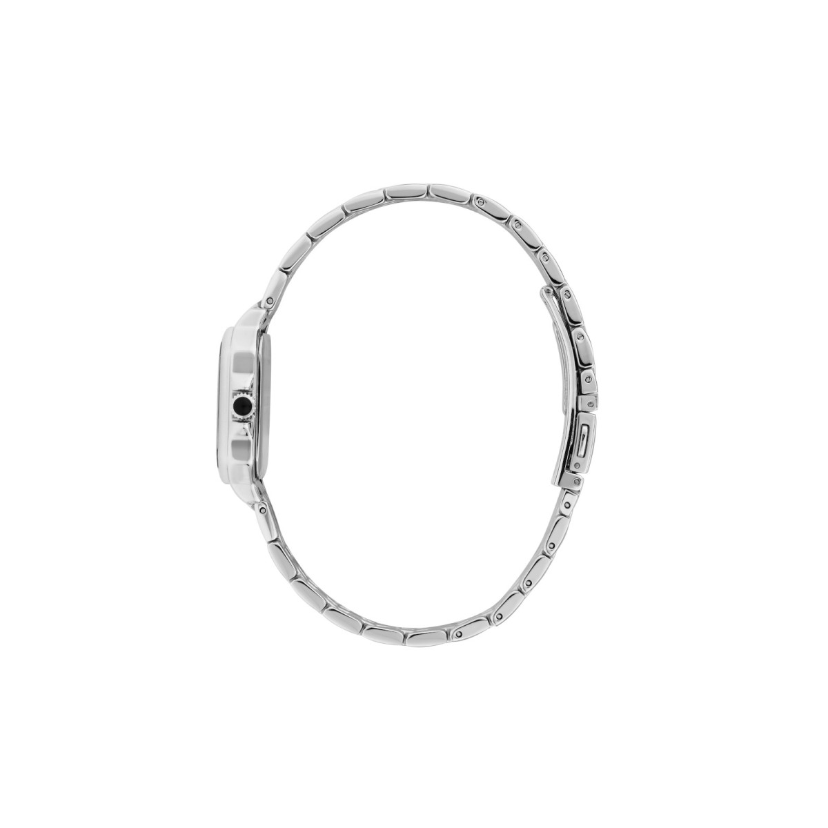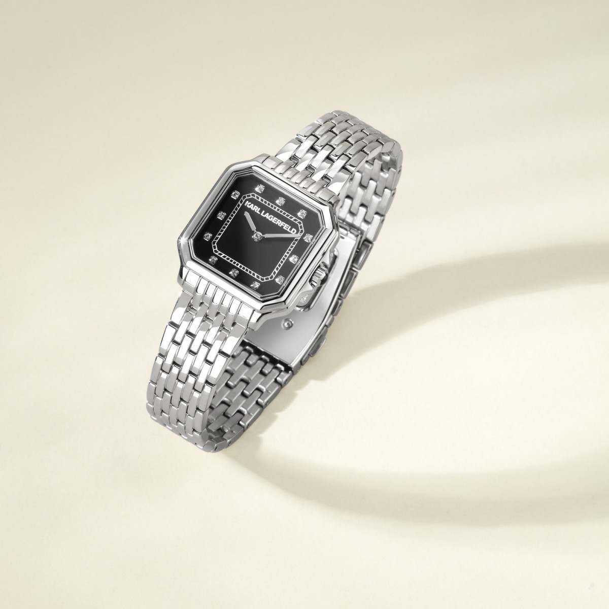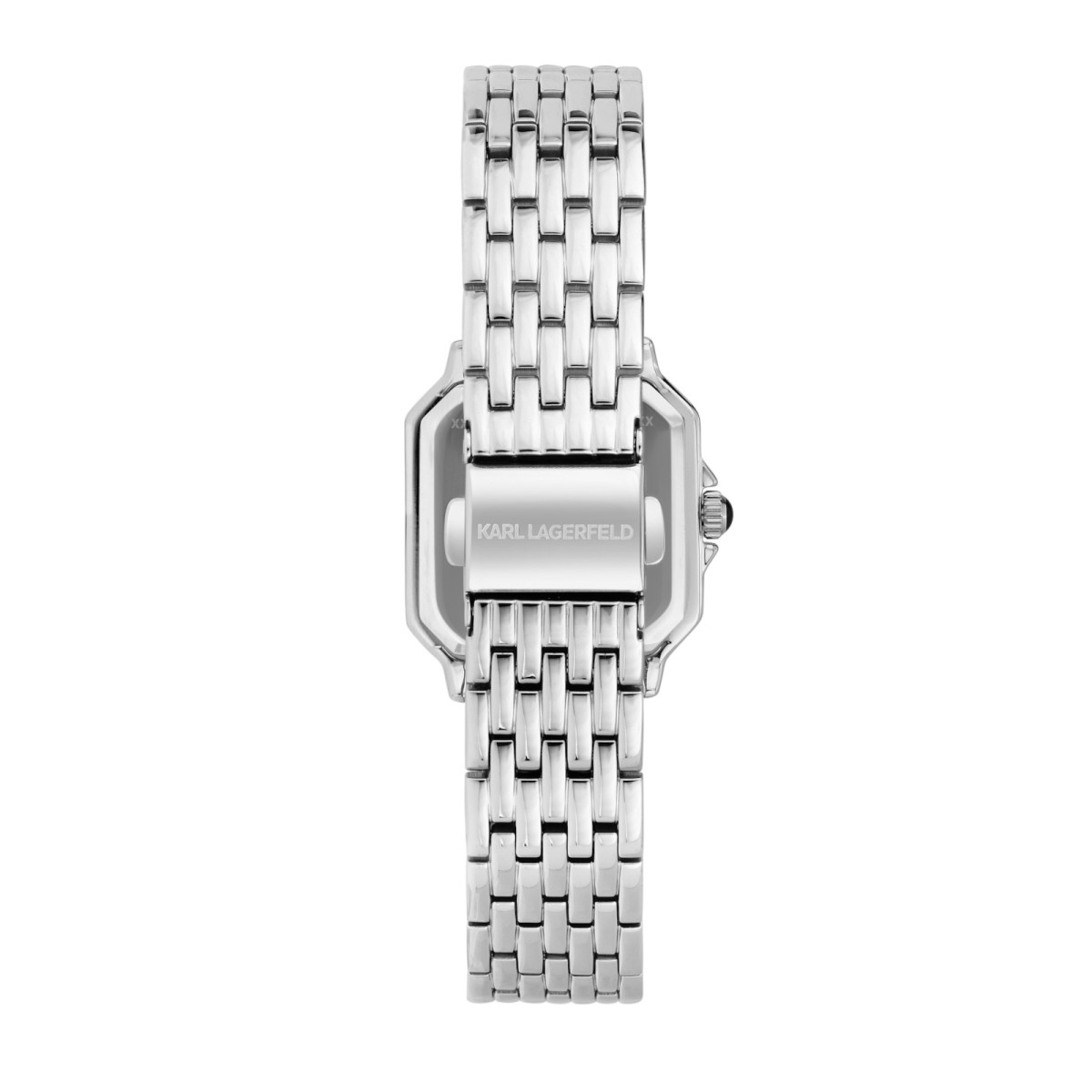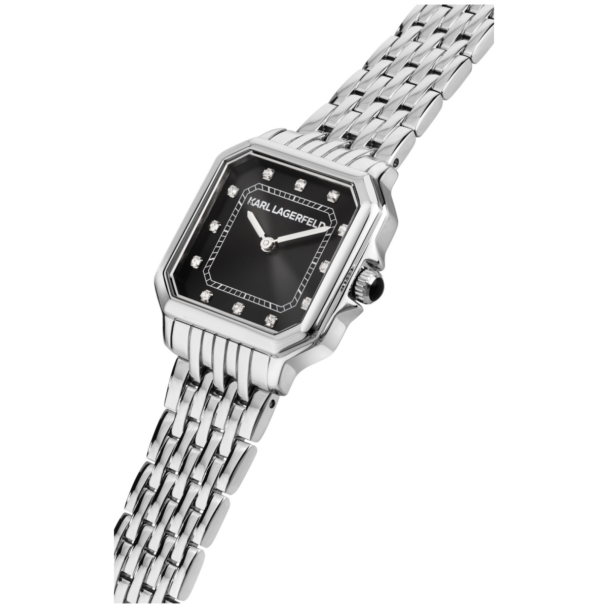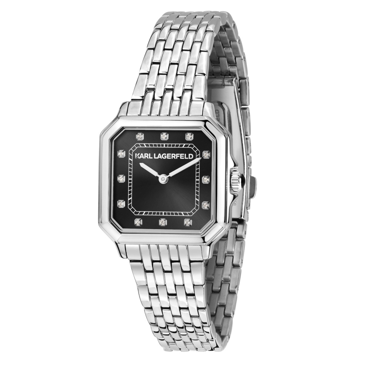 Γυναικείο ρολόι KARL LAGERFELD διαμέτρου 28x33mm με μηχανισμό Quartz ακριβείας. Έχει μαύρο καντράν με ασημί δείκτες και λεπτομέρειες και είναι διακοσμημένο με πέτρες. Η κάσα του είναι από ανοξείδωτο ατσάλι με κρύσταλλο από ορυκτό κρύσταλλο. Έχει μπρασελέ από ανοξείδωτο ατσάλι και κούμπωμα ασφαλείας.