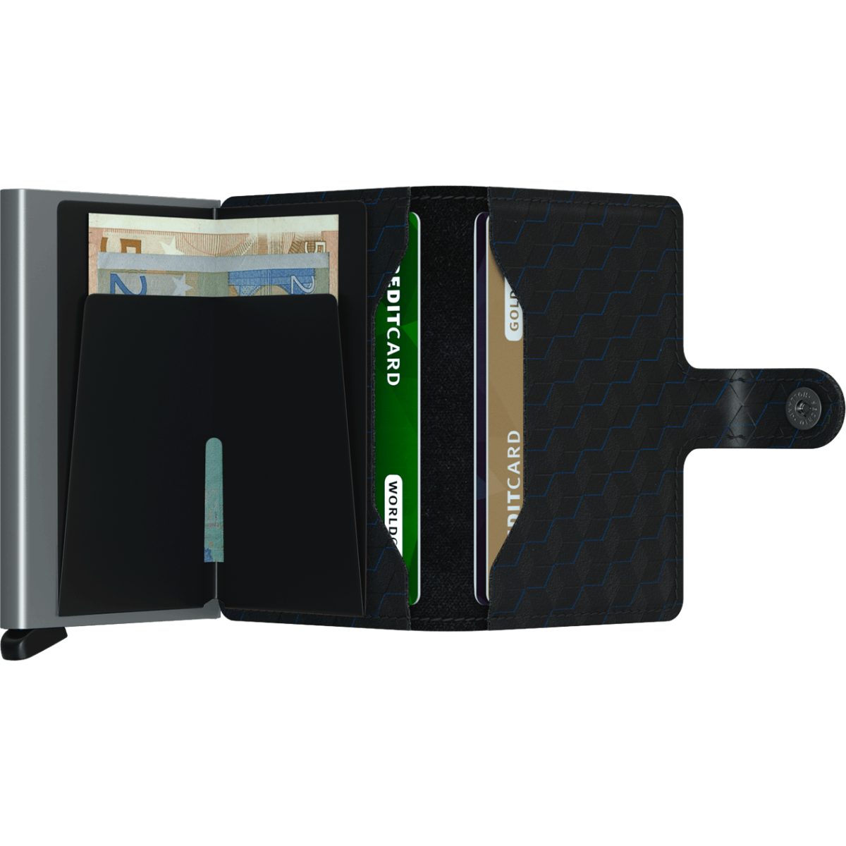 Δερμάτινη μικρή καρτοθήκη με εξαιρετικά πολλούς χώρους που μπορεί να αντικαταστήσει ακόμα και το πορτοφόλι. Χωράει 6 λείες ή 4 ανάγλυφες πιστωτικές κάρτες, διαθέτει θέση για χαρτονομίσματα και δύο επιπλέον θήκες για επαγγελματικές ή πιστωτικές κάρτες ή δίπλωμα οδήγησης. Μπορεί να χωρέσει σε κάθε τσέπη ακόμα και στην μπροστινή. Ο βραβευμένος μηχανισμός με το Red Dot Design Award επιτρέπει την εξαγωγή των καρτών με μία μόνο κίνηση επίσης διαθέτει προστασία RFID (αποτροπή ηλεκτρονικής κλοπής δεδομένων και μη εξουσιοδοτημένων συναλλαγών πιστωτικής κάρτας). Κατασκευάζεται στην Ολλανδία.- Κατασκευαστής: Secrid