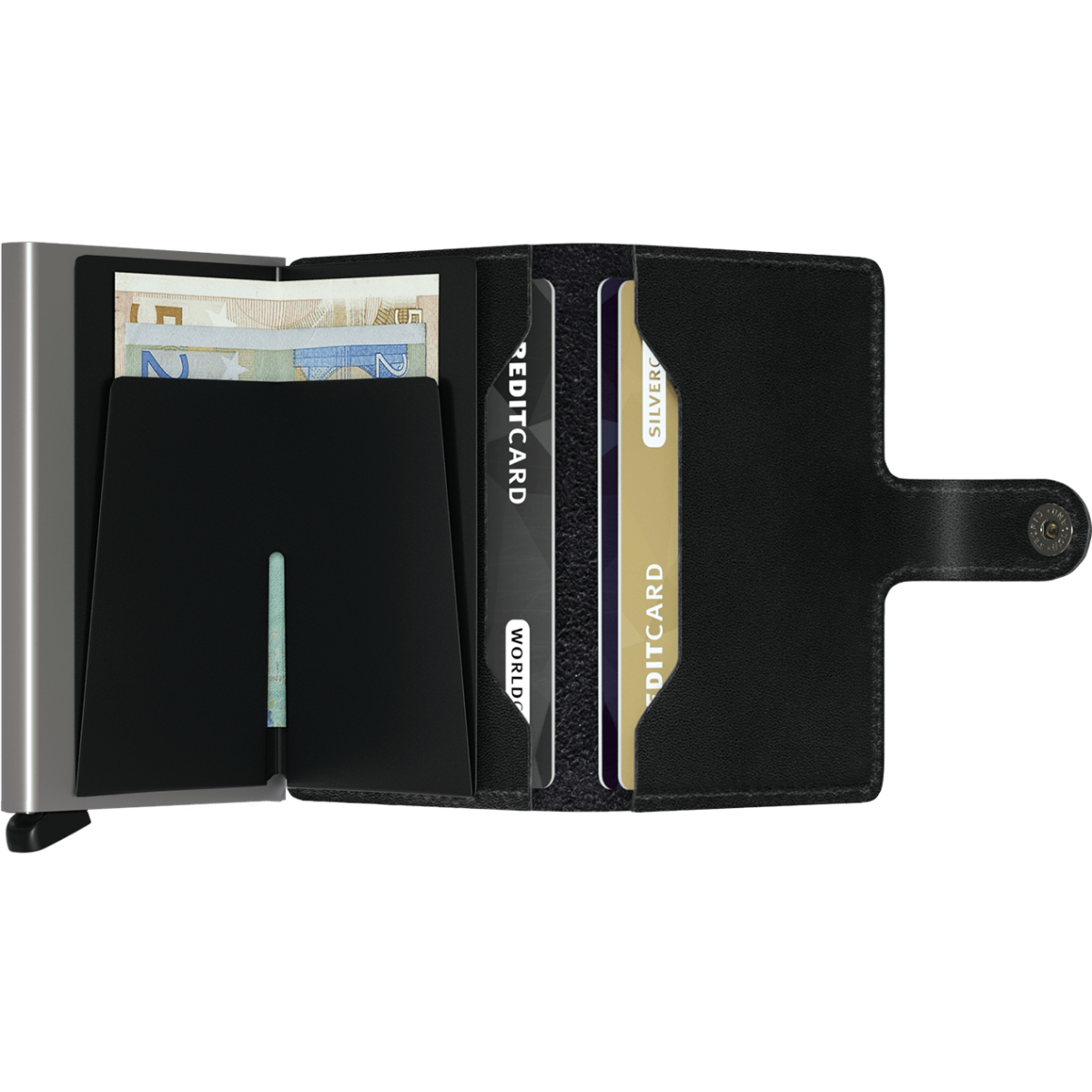 Δερμάτινη μικρή καρτοθήκη με εξαιρετικά πολλούς χώρους που μπορεί να αντικαταστήσει ακόμα και το πορτοφόλι. Χωράει 6 λείες ή 4 ανάγλυφες πιστωτικές κάρτες, διαθέτει θέση για χαρτονομίσματα και δύο επιπλέον θήκες για επαγγελματικές ή πιστωτικές κάρτες ή δίπλωμα οδήγησης. Μπορεί να χωρέσει σε κάθε τσέπη ακόμα και στην μπροστινή. Ο βραβευμένος μηχανισμός με το Red Dot Design Award επιτρέπει την εξαγωγή των καρτών με μία μόνο κίνηση επίσης διαθέτει προστασία RFID (αποτροπή ηλεκτρονικής κλοπής δεδομένων και μη εξουσιοδοτημένων συναλλαγών πιστωτικής κάρτας). Κατασκευάζεται στην Ολλανδία.- Κατασκευαστής: Secrid