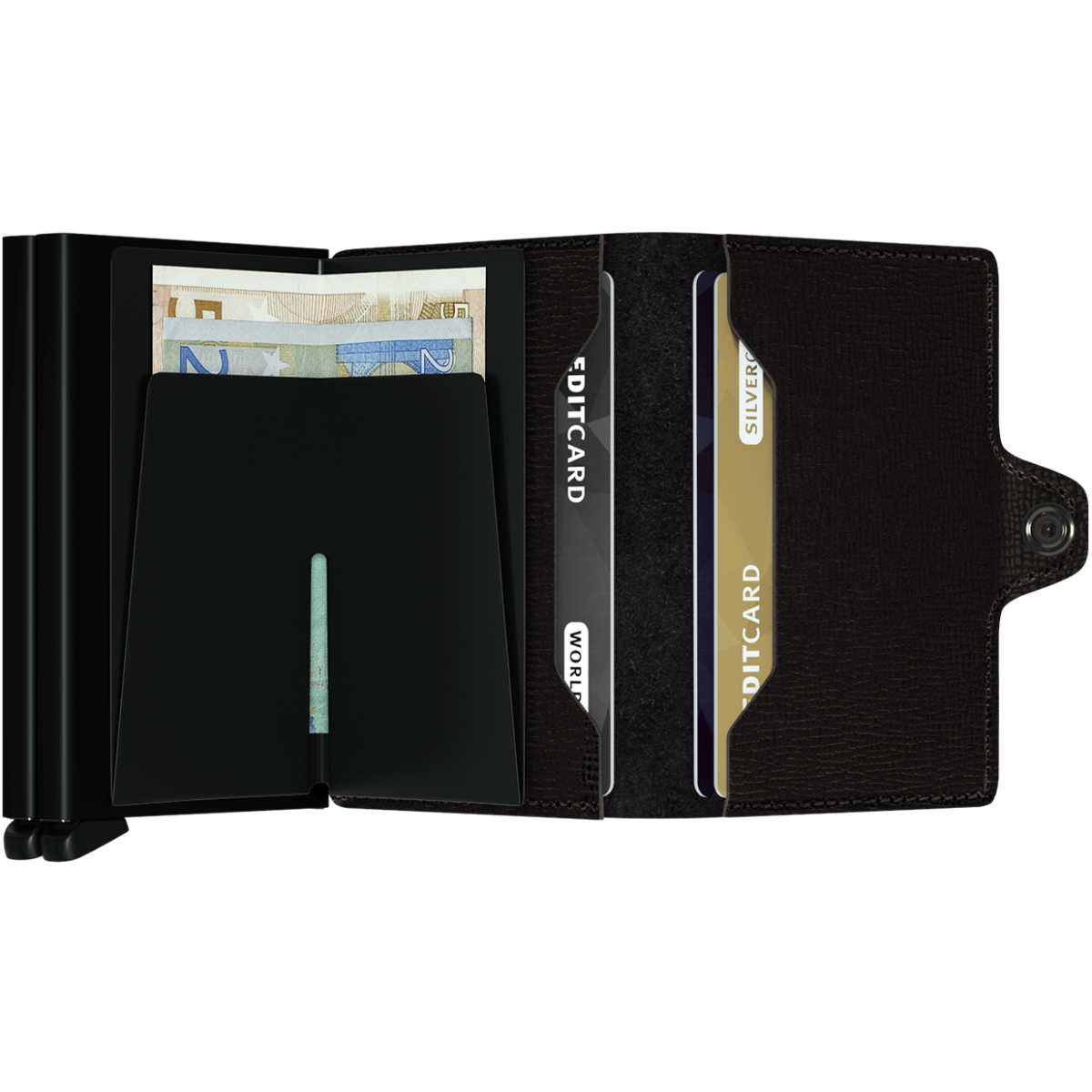 Δερμάτινη μικρή καρτοθήκη με εξαιρετικά πολλούς χώρους που μπορεί να αντικαταστήσει ακόμα και το πορτοφόλι. Χωράει 12 λείες ή 8 ανάγλυφες πιστωτικές κάρτες, διαθέτει θέση για χαρτονομίσματα και δύο επιπλέον θήκες για επαγγελματικές ή πιστωτικές κάρτες ή δίπλωμα οδήγησης. Μπορεί να χωρέσει σε κάθε τσέπη ακόμα και στην μπροστινή. Ο βραβευμένος μηχανισμός με το Red Dot Design Award επιτρέπει την εξαγωγή των καρτών με μία μόνο κίνηση επίσης διαθέτει προστασία RFID (αποτροπή ηλεκτρονικής κλοπής δεδομένων και μη εξουσιοδοτημένων συναλλαγών πιστωτικής κάρτας). Κατασκευάζεται στην Ολλανδία.- Κατασκευαστής: Secrid