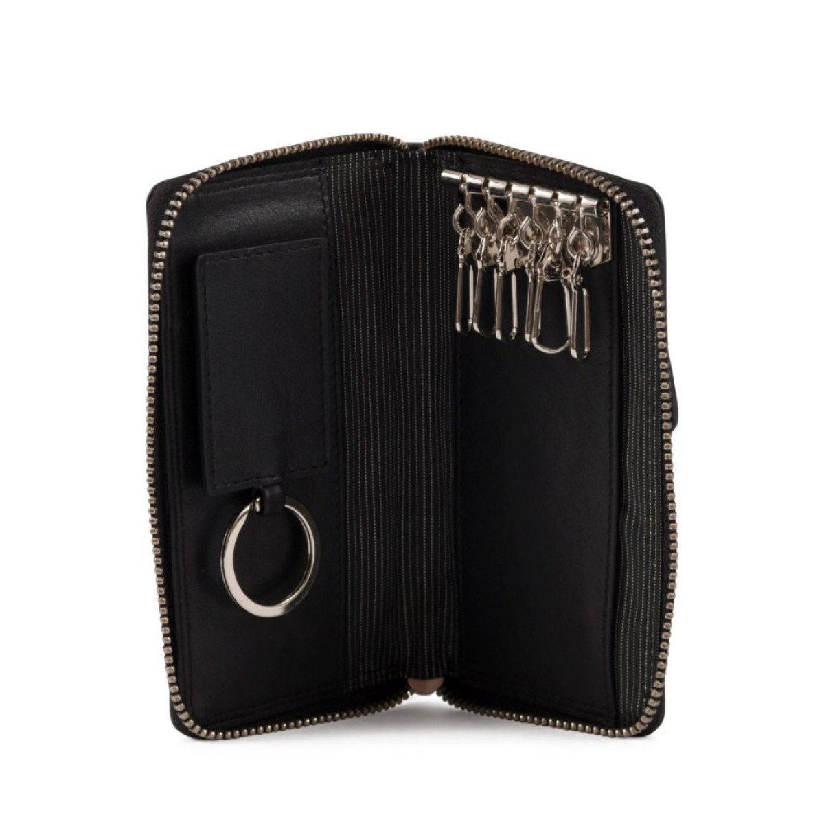 Μαύρη δερμάτινη κλειδοθήκη. Έχει μία υποδοχή για 2 κάρτες, μία εξωτερική θήκη με φερμουάρ, 1 κρίκο αποσπώμενο και 6 γάντζους για κλειδιά. Ιδανικός συνδυασμός πορτοφολιού και θήκης κλειδιών. Κατασκευάζεται στην Ιταλία.- Κατασκευαστής: GIANNI CONTI