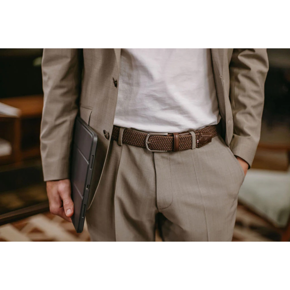 Η ζώνη Florence La Boucle, πλεγμένη σε καφέ χρώμα.