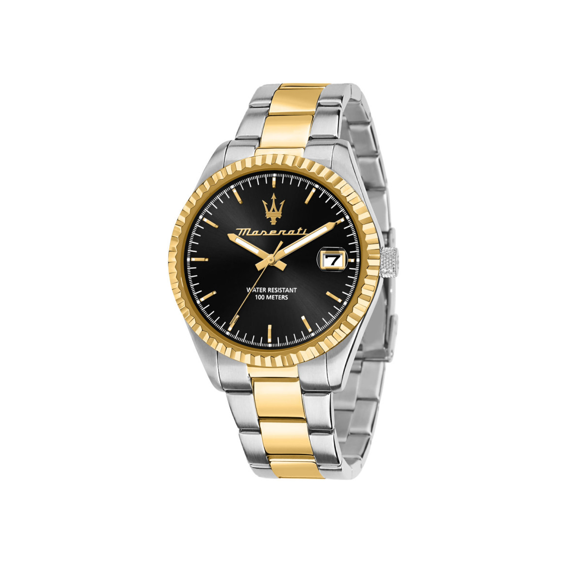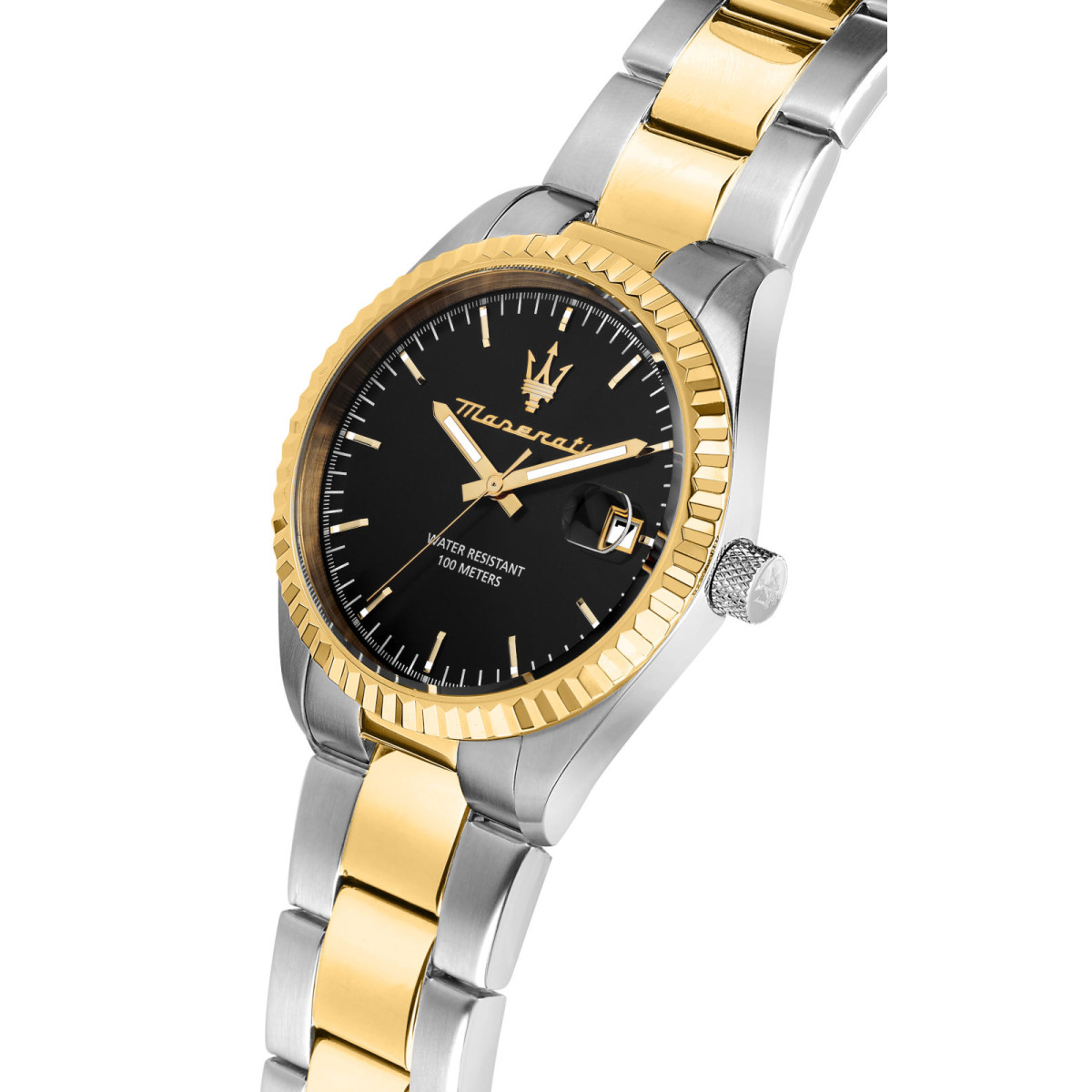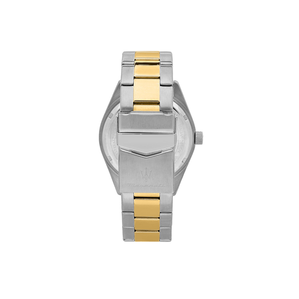 Ανδρικό ρολόι MASERATI  διαμέτρου 43mm, με μηχανισμό Quartz ακριβείας. Έχει μαύρο καντράν με επίχρυσους δείκτες και λεπτομέρειες. Η κάσα του είναι από ανοξείδωτο ατσάλι με επίχρυσες λεπτομέρειες. Έχει μπρασελέ από ανοξείδωτο ατσάλι με επίχρυσες λεπτομέρειες.