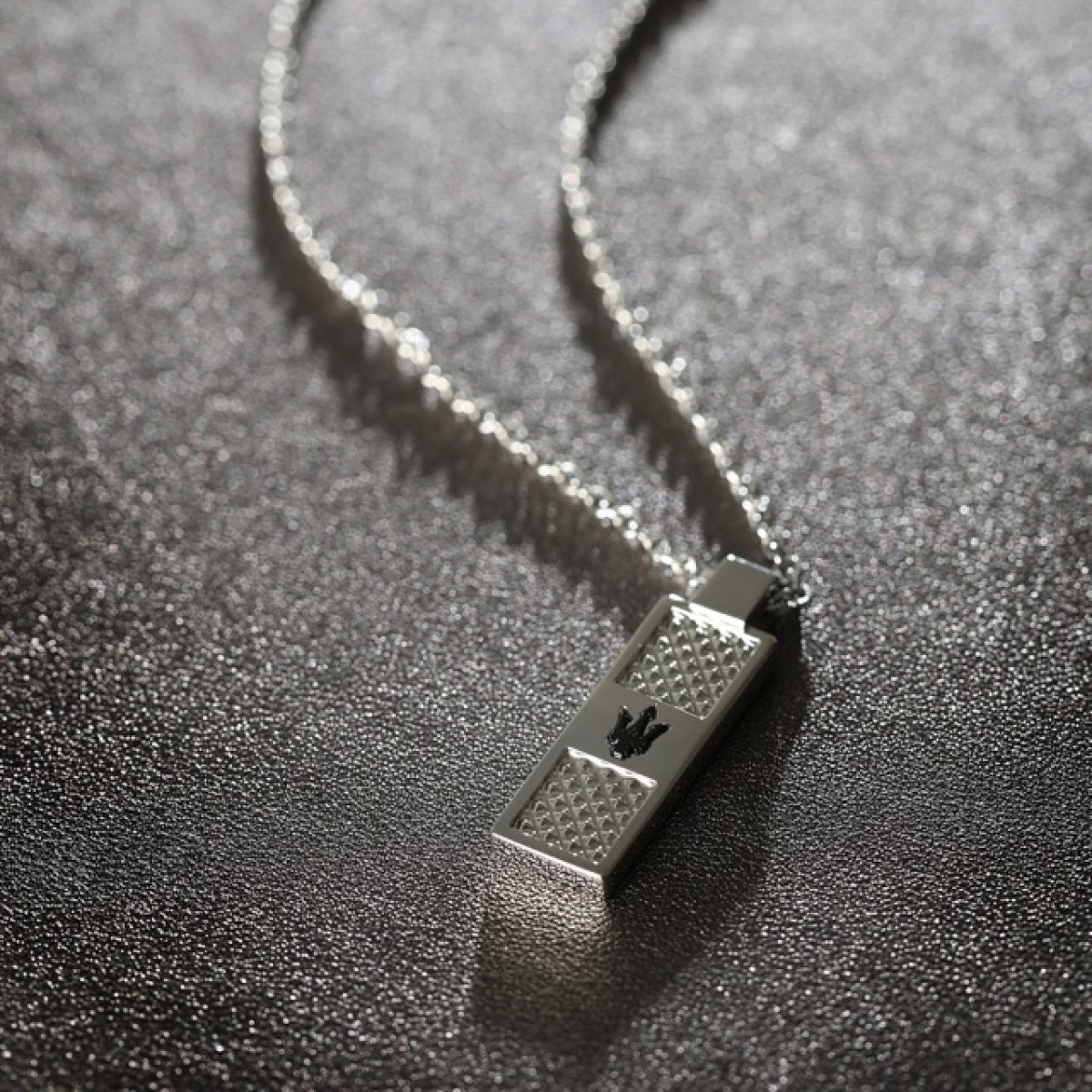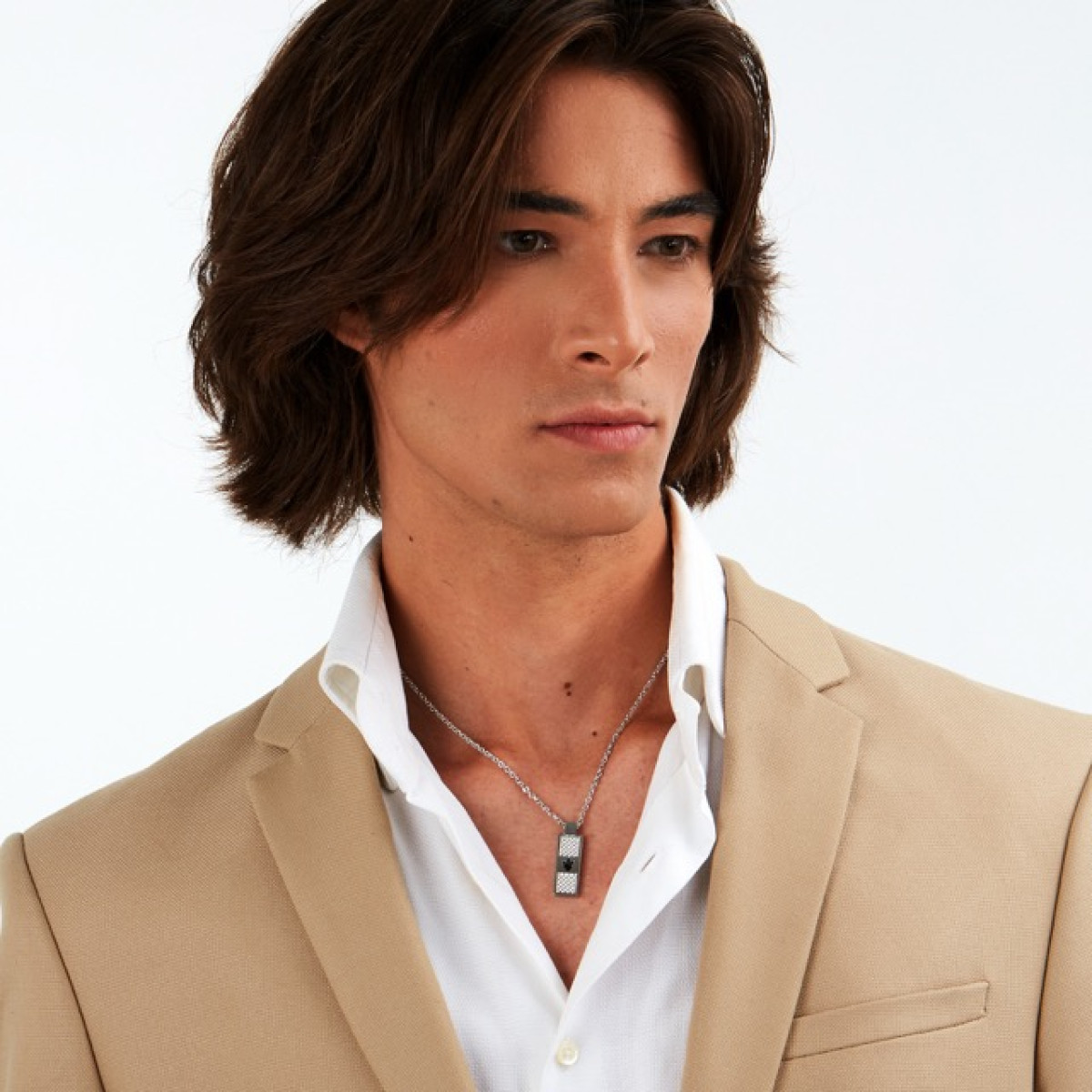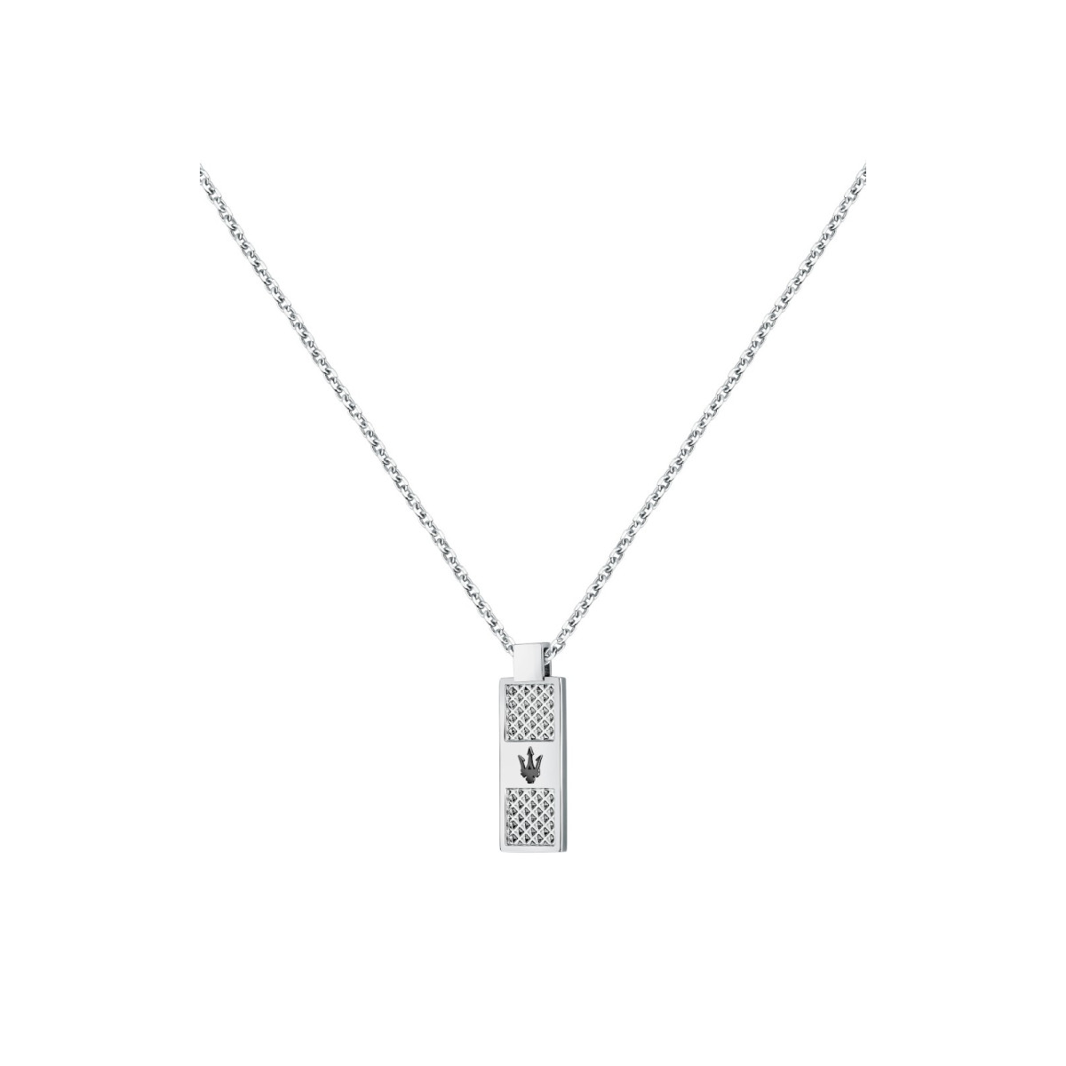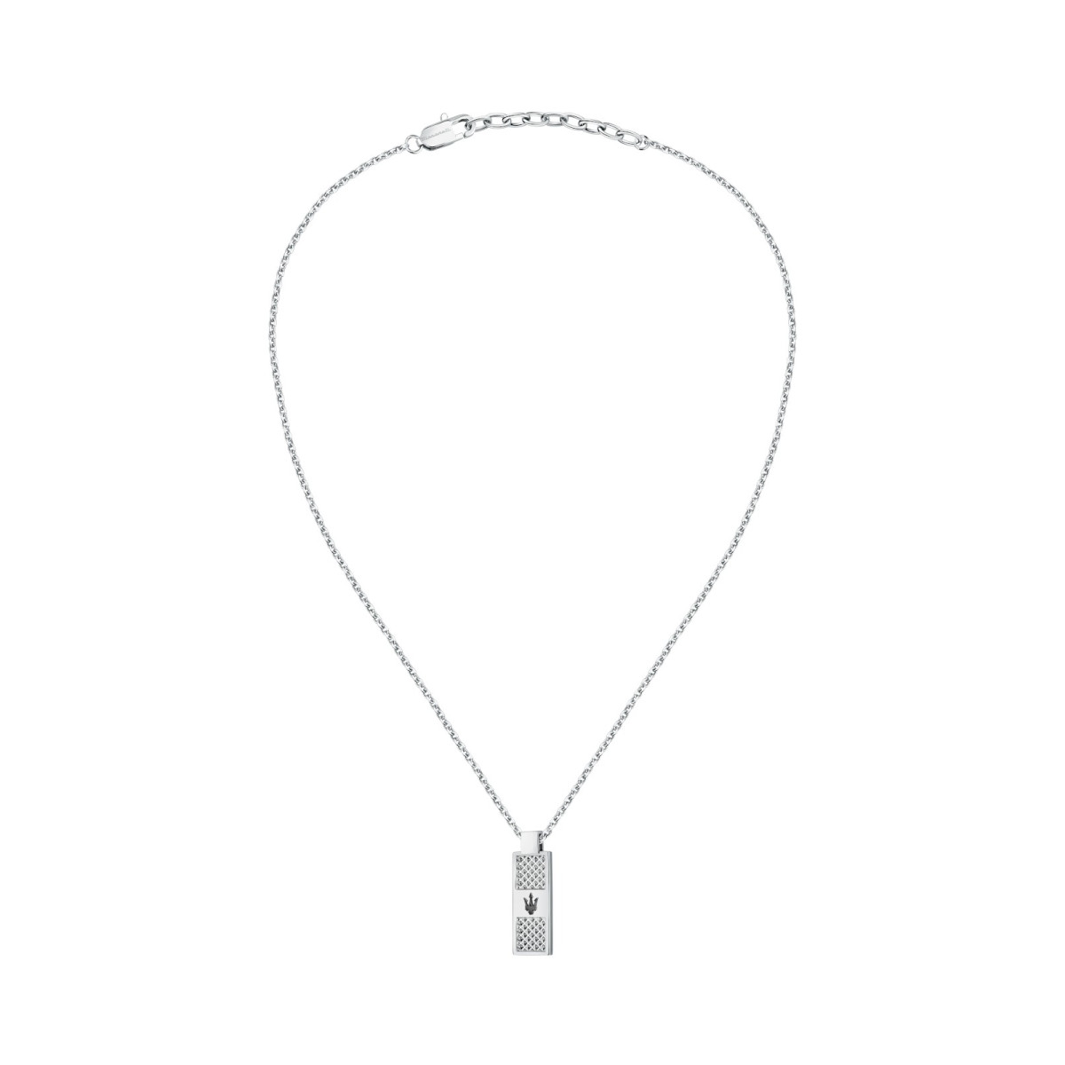 Ανδρικό κολιέ MASERATI από ανοξείδωτο ατσάλι. To κολιέ είναι ασημένιου χρώματος με λογότυπο της εταιρείας και μαύρες λεπτομέρειες(45+5cm).