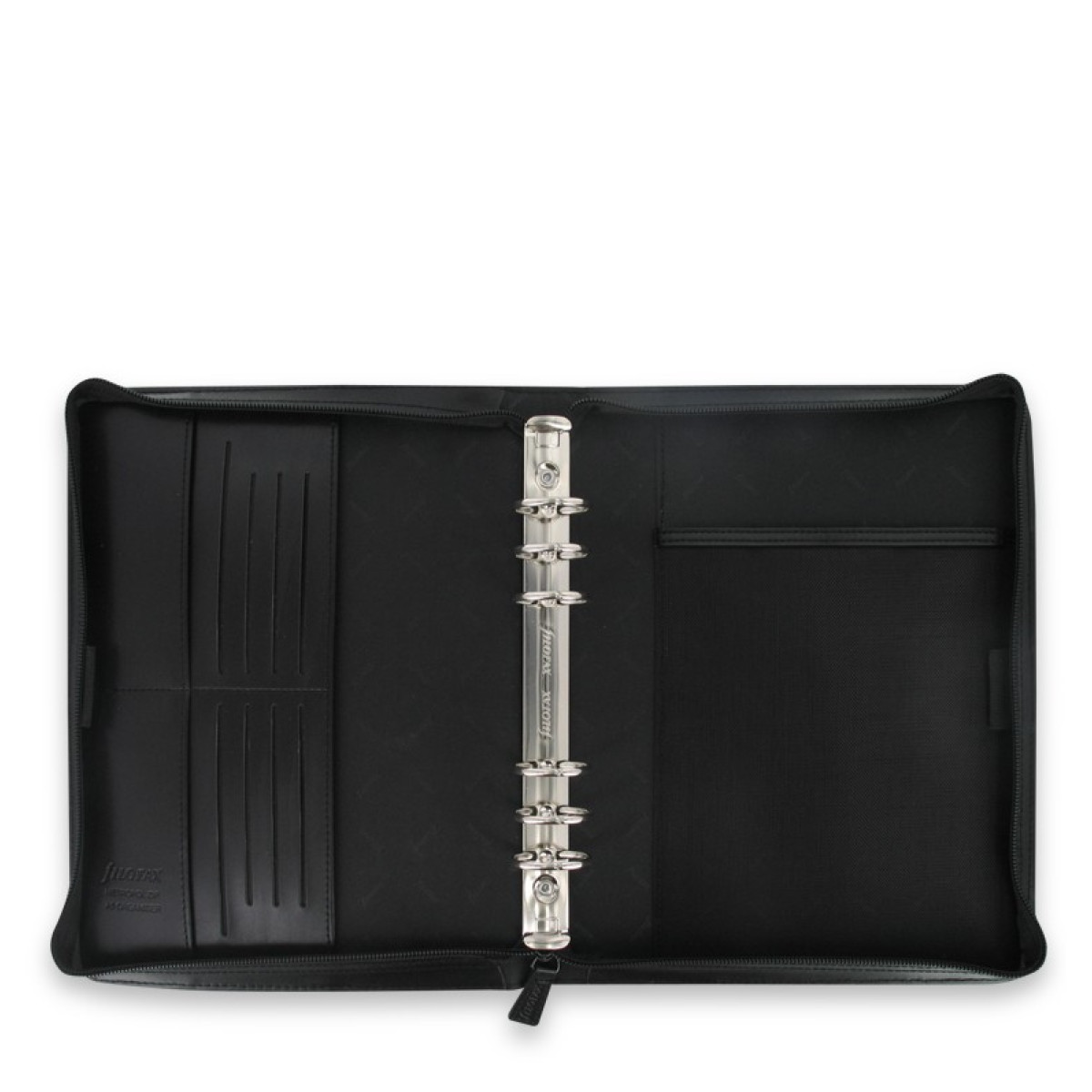 Κομψό και κλασικό στυλ σε μαύρο χρώμα. Πολύ απλά, το τέλειο organiser και με φερμουάρ για καθημερινή χρήση. Περιέχει ημερολόγιο εβδομάδα σε δυο σελίδες,χάρακας/σελιδοδείκτης,υπενθυμίσεις,επαφές,ευρετήριο,λευκές σημειώσεις,χρωματιστές σημειώσεις. Το δεξί εσώφυλλο έχει θήκη για σημειωματάριο και ελαστική θήκη για στυλό. Το αριστερό εσώφυλλο έχει δέκα θήκες για κάρτες, κάθετη slip θήκη και ελαστική θήκη για στυλό.