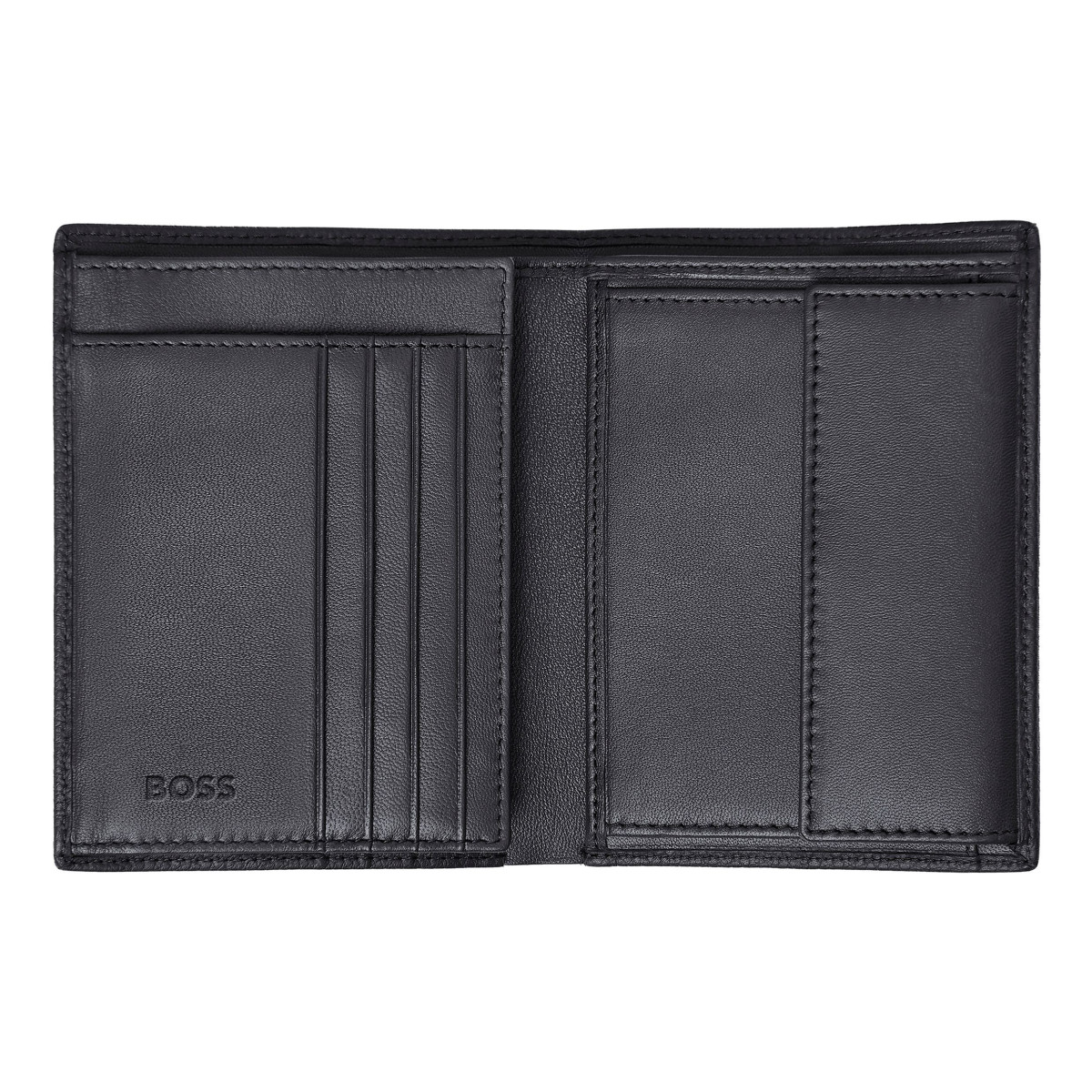 Δερμάτινο HUGO BOSS ανδρικό πορτοφόλι σε μαύρο χρώμα με 8 θέσεις πιστωτικών καρτών, 2 χώρους για χαρτονομίσματα, 1 θήκη με διαφάνεια ,θήκη για κέρματα και 4 επιπλέον χώρους.