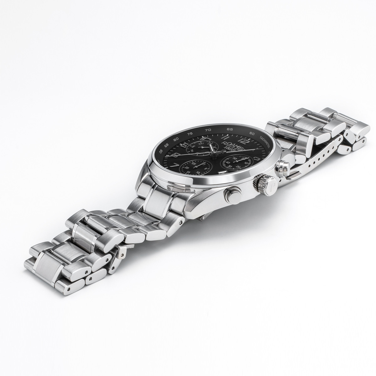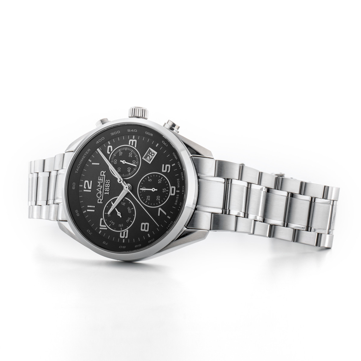 Ανδρικό ρολόι ROAMER διαμέτρου 43mm, με Ελβετικό Quartz μηχανισμό. Έχει μαύρο καντράν. Η κάσα του είναι από ανοξείδωτο ατσάλι. Έχει μπρασελέ από ανοξείδωτο ατσάλι.