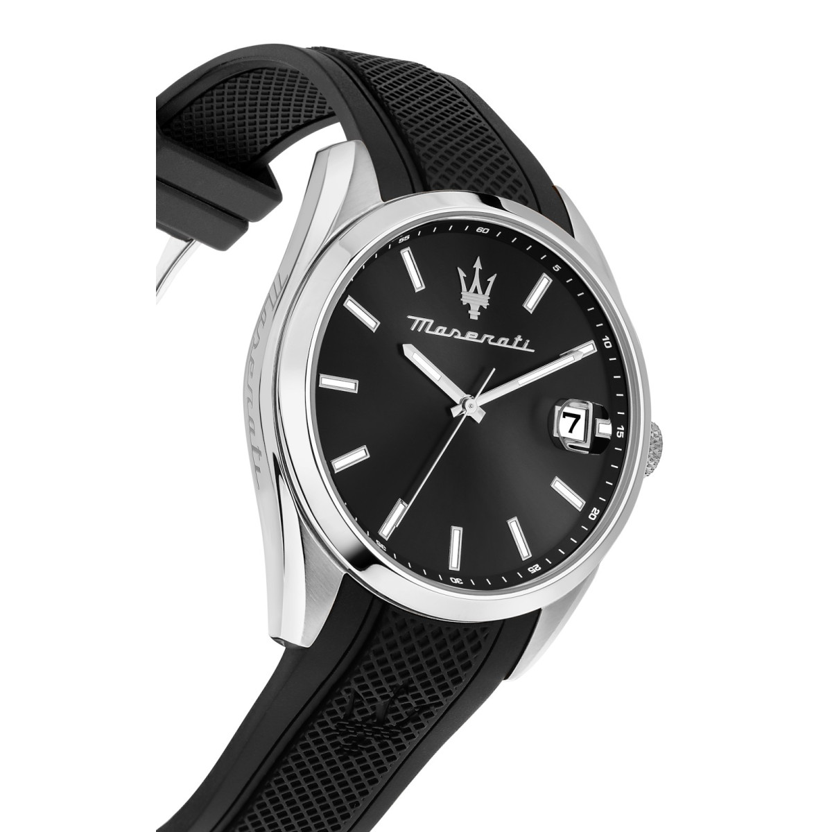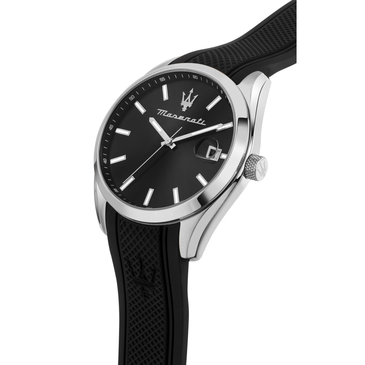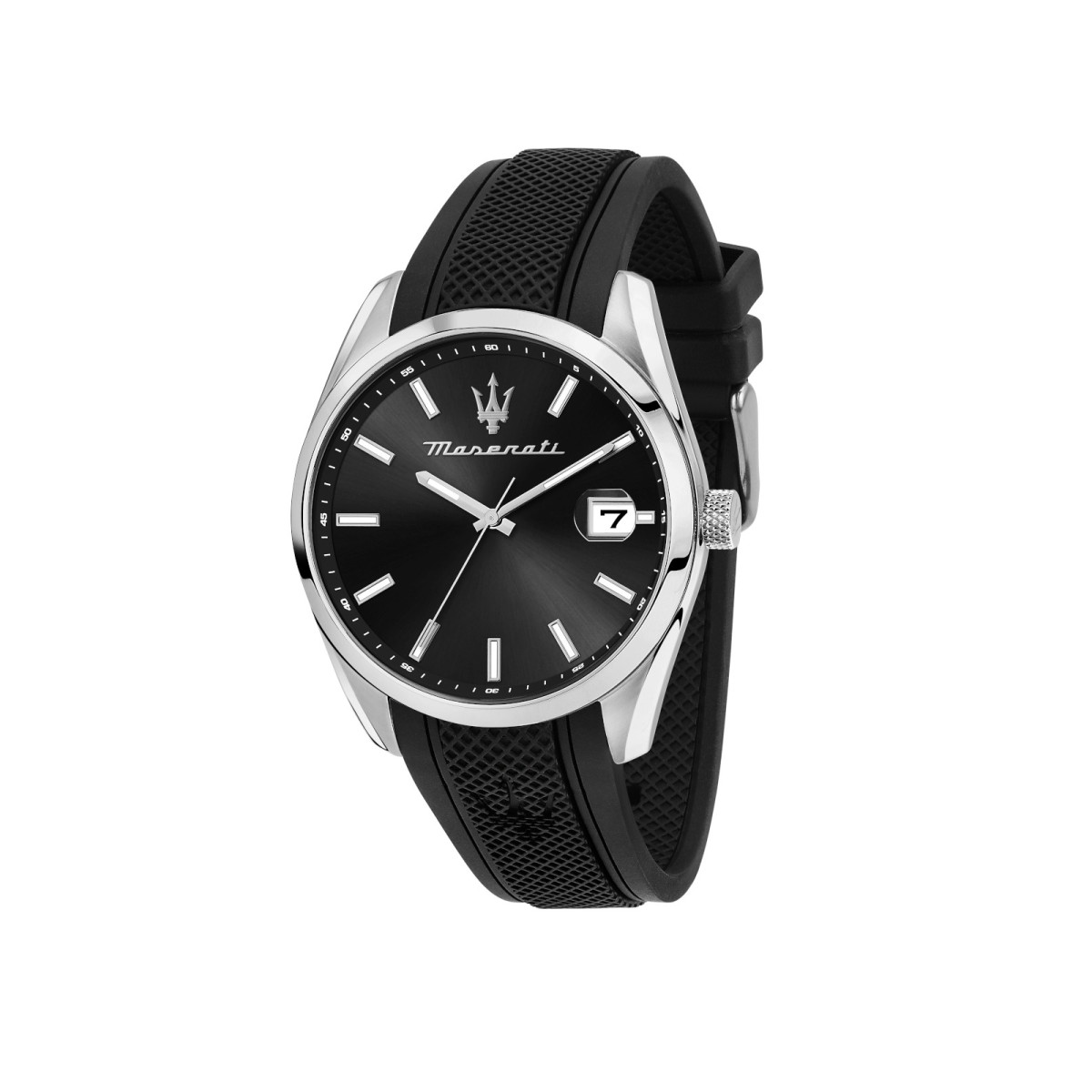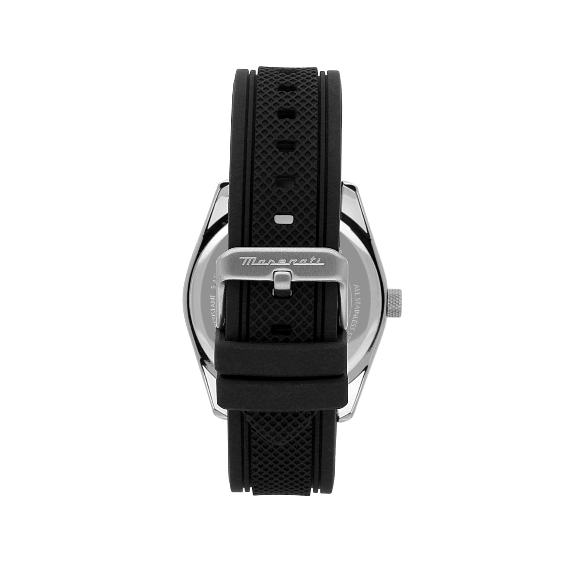 Ανδρικό ρολόι MASERATI διαμέτρου 43mm, με μηχανισμό Quartz ακριβείας. Έχει μαύρο καντράν. Η κάσα του είναι από ανοξείδωτο ατσάλι. Έχει μαύρο καουτσούκ λουράκι.