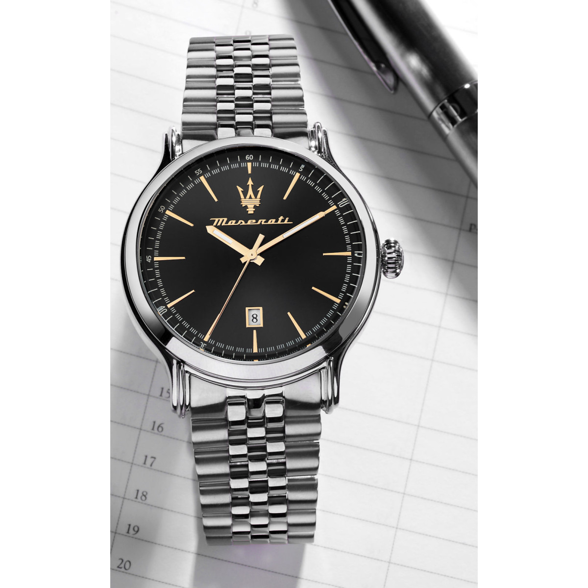Ανδρικό ρολόι MASERATI διαμέτρου 42mm, με μηχανισμό Quartz Multi-Function ακριβείας. Έχει μαύρο καντράν με επίχρυσες λεπτομέρειες. Η κάσα του είναι από ανοξείδωτο ατσάλι. Έχει μπρασελέ από ανοξείδωτο ατσάλι.
