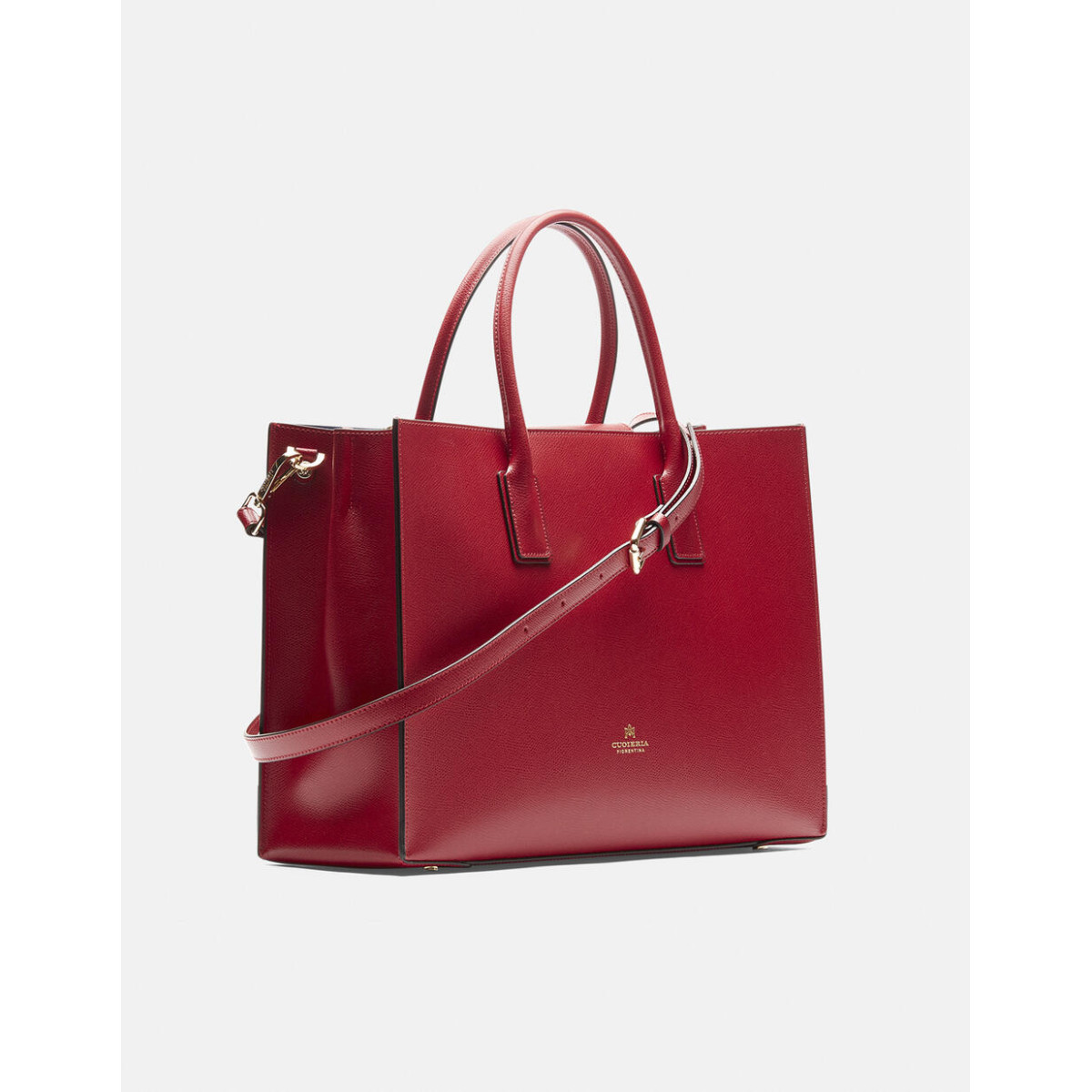 Κομψή και εύχρηστη, αυτή η μεγάλη κόκκινη ορθογώνια τσάντα από δέρμα palmellato είναι δυνατή, εκλεπτυσμένη και συμπαγής με διπλό μαγνητικό κλείσιμο. Έχει άκαμπτο ορθογώνιο σχήμα, ανάγλυφο λογότυπο, καρφιά στο κάτω μέρος και κατασκευασμένη στο χέρι. Το εσωτερικό έχει τρεις θήκες, η μία με φερμουάρ, είναι σε μπλε χρώμα που δίνει χαρακτήρα σε αυτή την τσάντα καθιστώντας την ιδανική τόσο για casual όσο και για επίσημη εμφάνιση. Μπορεί να χρησιμοποιηθεί ως τσάντα χειρός ή, χάρη στον αφαιρούμενο ιμάντα ώμου, ως χιαστί που το καθιστά απαραίτητο για κάθε ηλικία. Κατασκευασμένο στην Ιταλία.
