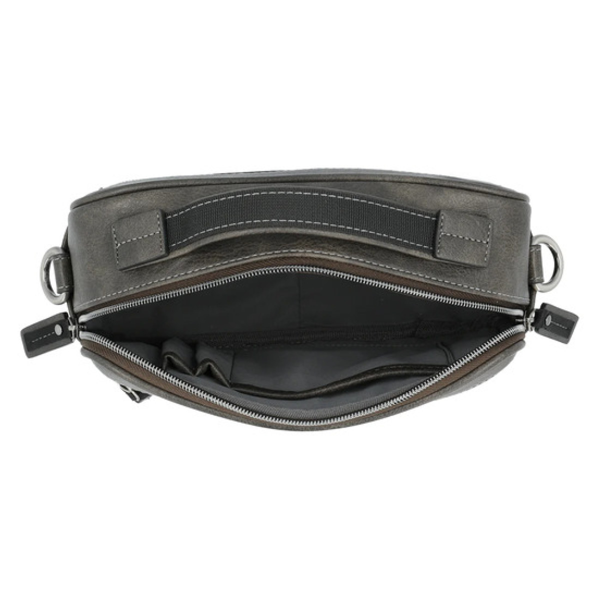 Αυτή η τσάντα ώμου σε γκρι χρώμα εντυπωσιάζει με τον λειτουργικό σχεδιασμό της. Οι πρακτικές υποδοχές και θήκες με φερμουάρ εξασφαλίζουν τέλεια οργάνωση. Ο ιδανικός σύντροφος κάθε μέρα! Truly leather-free!