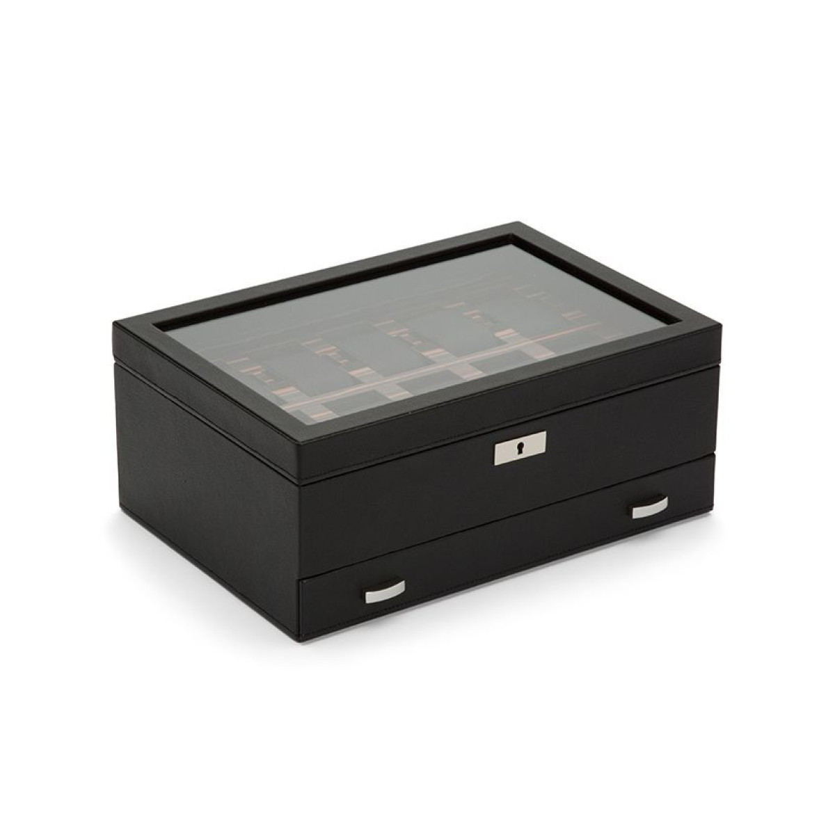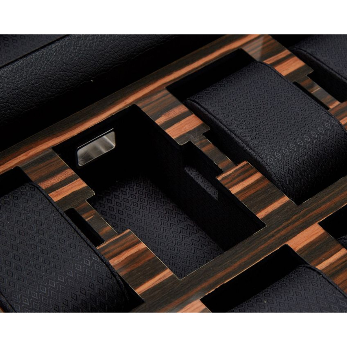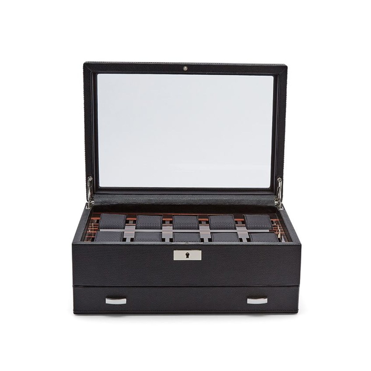 Θήκη ανδρικών κοσμημάτων. Οι ξύλινες λεπτομέρειες από έβενο και οι χρωμιωμένες μεταλλικές λεπτομέρειες είναι τα χαρακτηριστικά της σειράς Roadster - εμπνευσμένη από τα καλύτερα βρετανικά αυτοκίνητα, Jaguar, Aston Martin, Bristol και τα παρόμοια. Διαθέτει χώρους για αποθήκευση 10 ρολογιών και πολλές διαφορετικές υποδοχές για να οργανωθούν όλα τα αντρικά αξεσουάρ, όπως δαχτυλίδια και γραβατοπιάστρες, καρφίτσες γραβάτας καθώς και κοσμημάτων λαιμού και χεριού. Η θήκη επίσης διαθέτει άνοιγμα στο πίσω μέρος για να μπορείτε να φορτίσετε smart watch ενώ βρίσκονται μέσα στη θήκη. Επίσης οι υποδοχές για τα ρολόγια αιωρούνται για να έχουν τη μέγιστη προστασία.