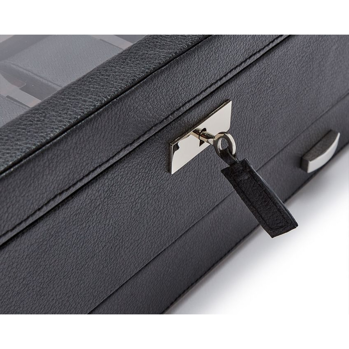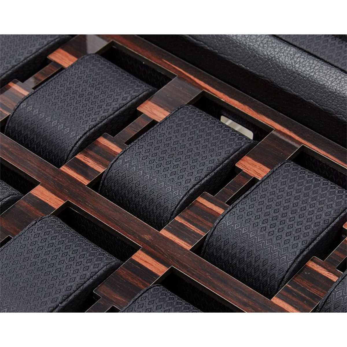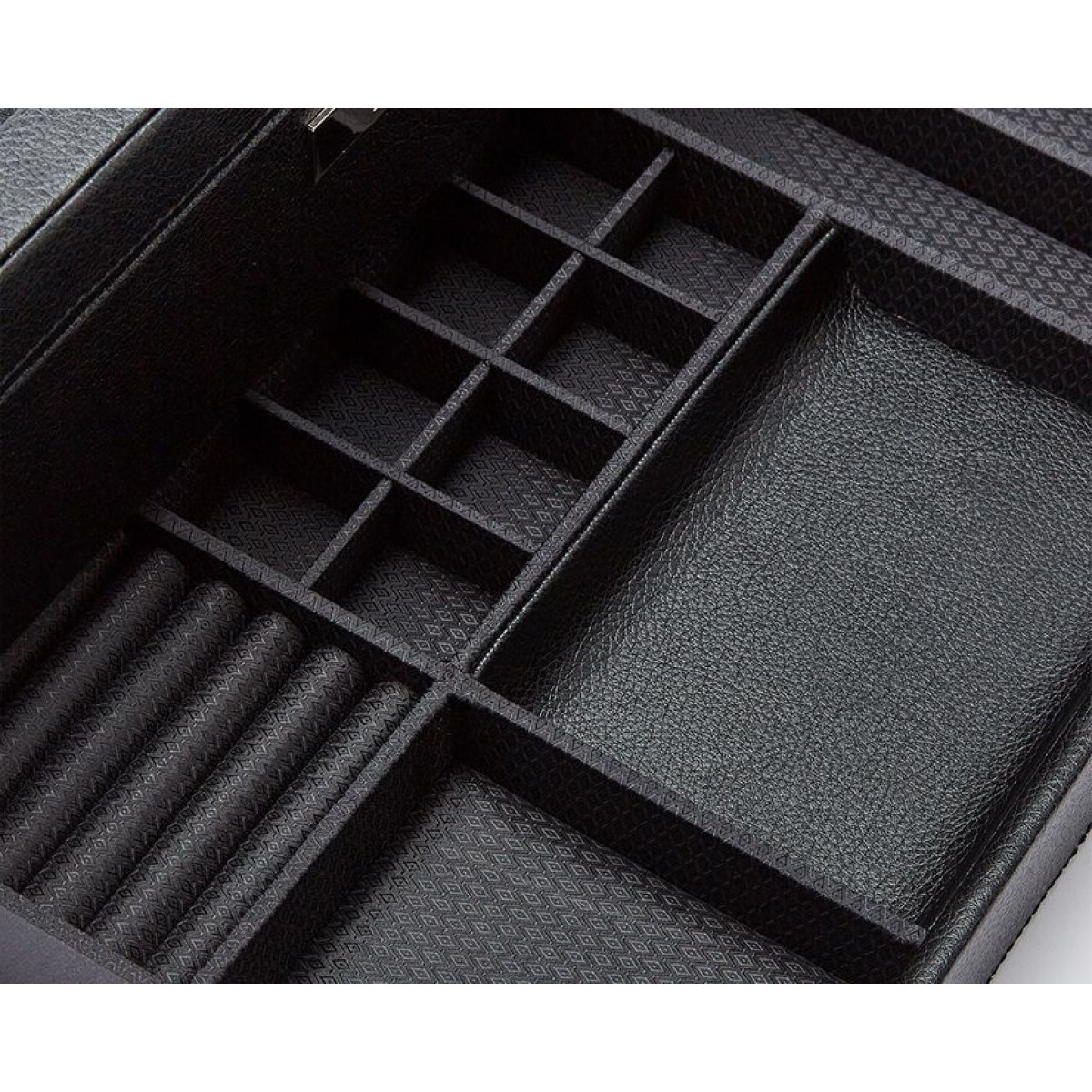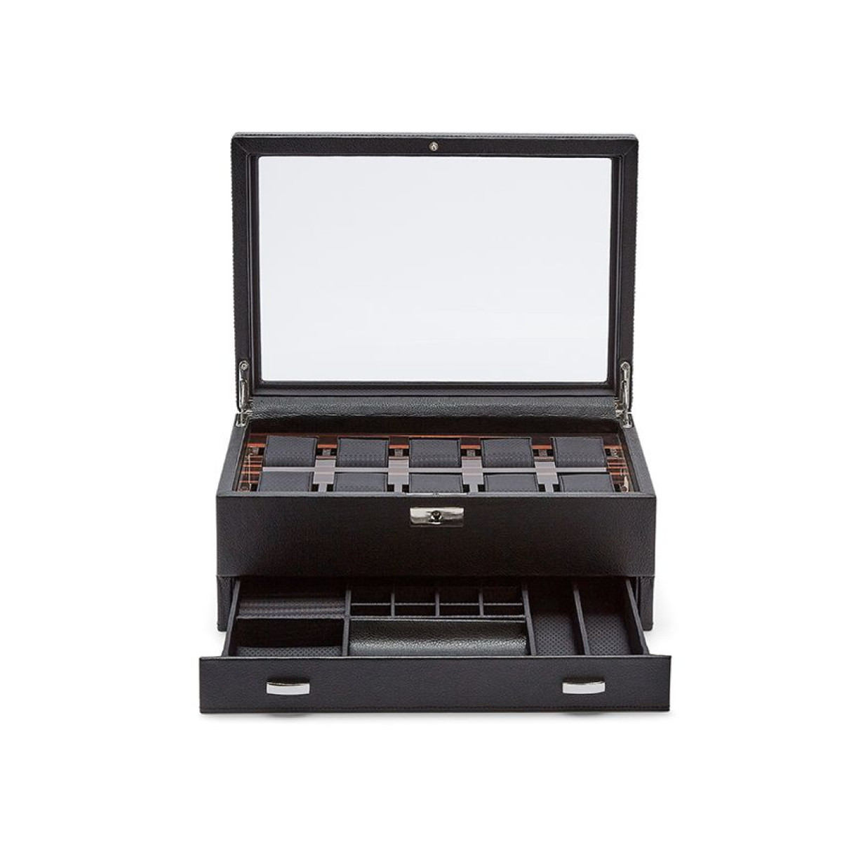 Θήκη ανδρικών κοσμημάτων. Οι ξύλινες λεπτομέρειες από έβενο και οι χρωμιωμένες μεταλλικές λεπτομέρειες είναι τα χαρακτηριστικά της σειράς Roadster - εμπνευσμένη από τα καλύτερα βρετανικά αυτοκίνητα, Jaguar, Aston Martin, Bristol και τα παρόμοια. Διαθέτει χώρους για αποθήκευση 10 ρολογιών και πολλές διαφορετικές υποδοχές για να οργανωθούν όλα τα αντρικά αξεσουάρ, όπως δαχτυλίδια και γραβατοπιάστρες, καρφίτσες γραβάτας καθώς και κοσμημάτων λαιμού και χεριού. Η θήκη επίσης διαθέτει άνοιγμα στο πίσω μέρος για να μπορείτε να φορτίσετε smart watch ενώ βρίσκονται μέσα στη θήκη. Επίσης οι υποδοχές για τα ρολόγια αιωρούνται για να έχουν τη μέγιστη προστασία.